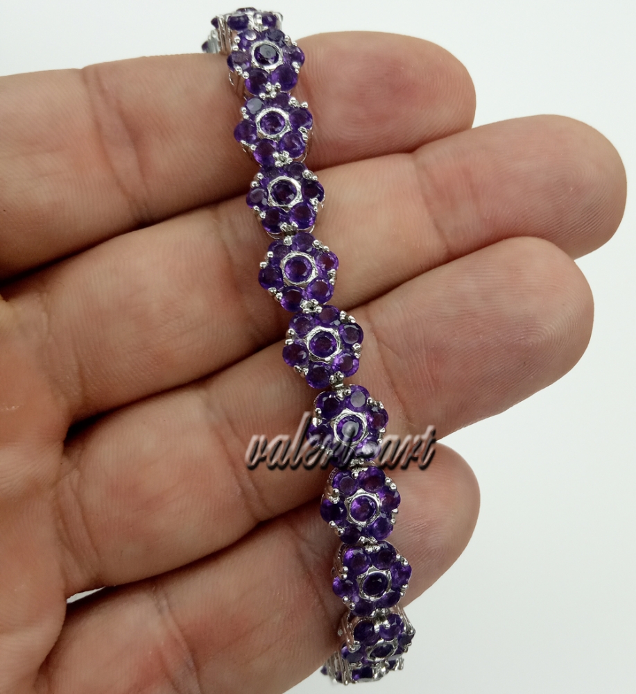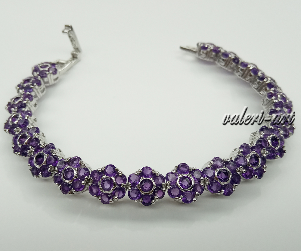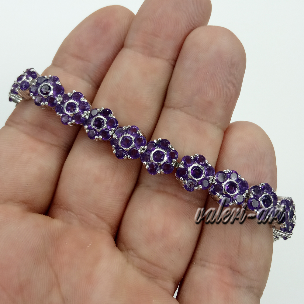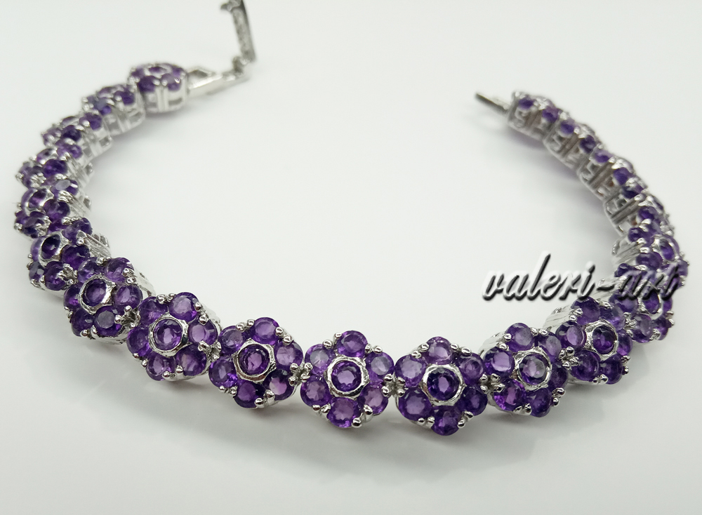 Стильный браслет из аметиста и серебра 925 пробы. Классическое сочетание цветов в классическом дизайне, всегда беспроигрышный вариант! Интересный, яркий, обязательно станет вашим самым любимым украшением! Использовано качественное серебро 925 пробы. Вы можете выбрать понравившиеся изделия или украшения из нашего каталога, в котором представлен широкий ассортимент украшений, подарков, сувениров, амулетов, оберегов, талисманов, колье, бус, браслетов, колец, серёг, ожерелий из камня аметист. А также узнать лечебные и магические свойства камня, посмотреть фото украшений и ювелирных изделий, подобрать камни по знакам зодиака и амулеты из драгоценного камня аметисты.
