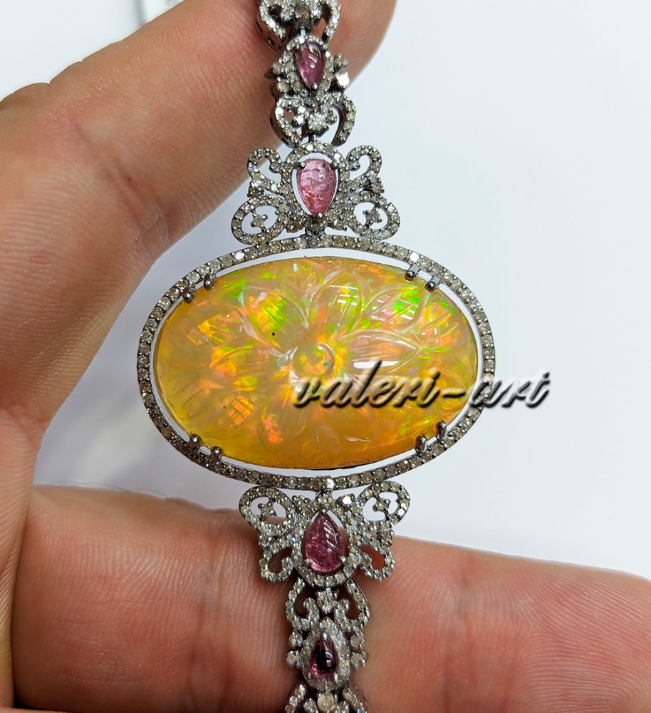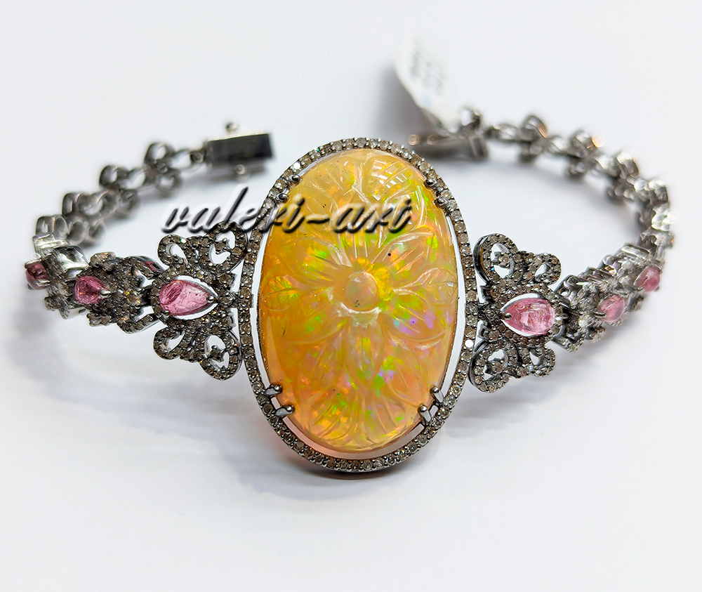 Серебряный браслет с натуральным крупным опалом турмалином и бриллиантами