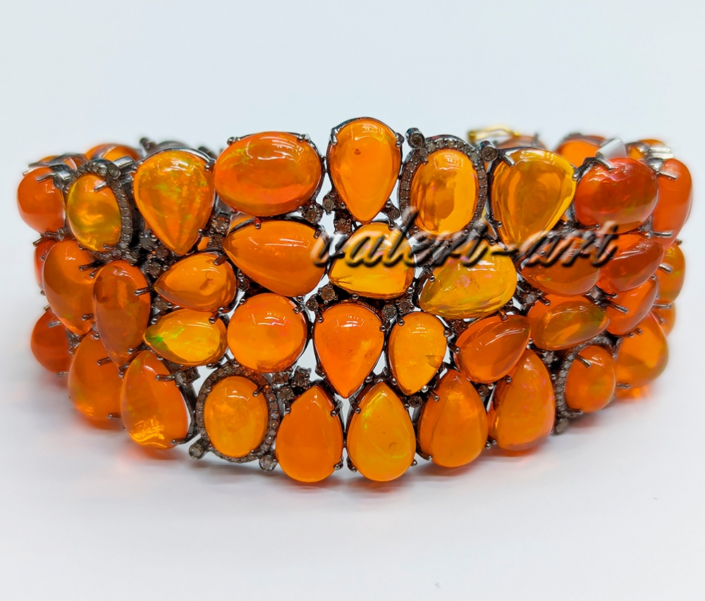 Серебряный браслет с натуральным огненным опалом и бриллиантами