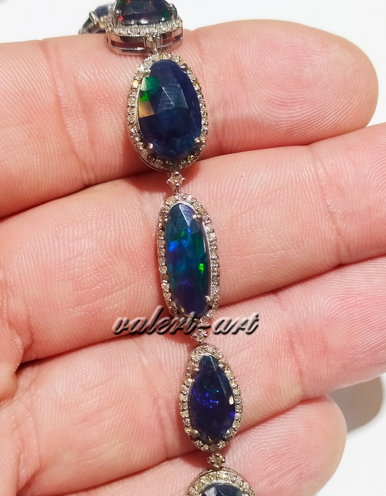 Серебряный браслет с натуральным черным опалом и бриллиантами