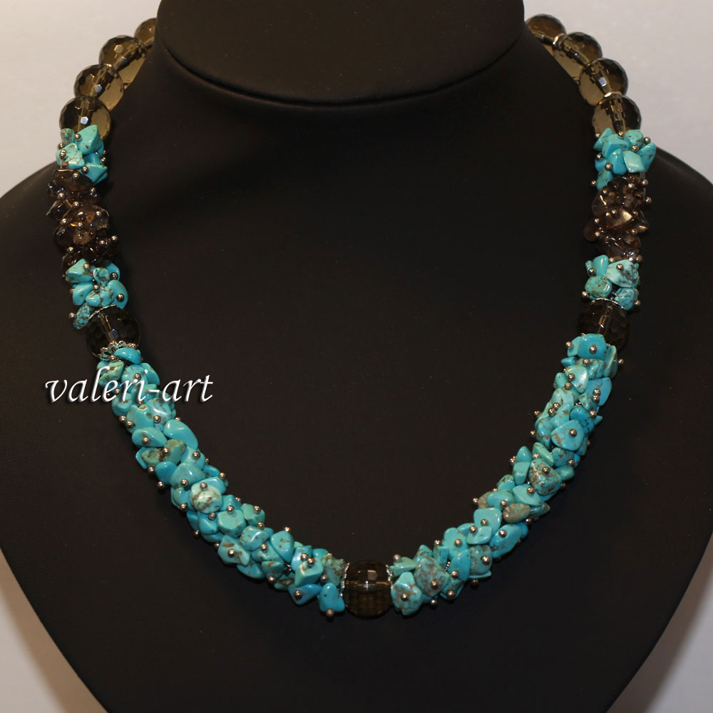 Бусы, колье из бирюзы и раухтопаза. Украшения из драгоценного камня бирюза и раухтопаз