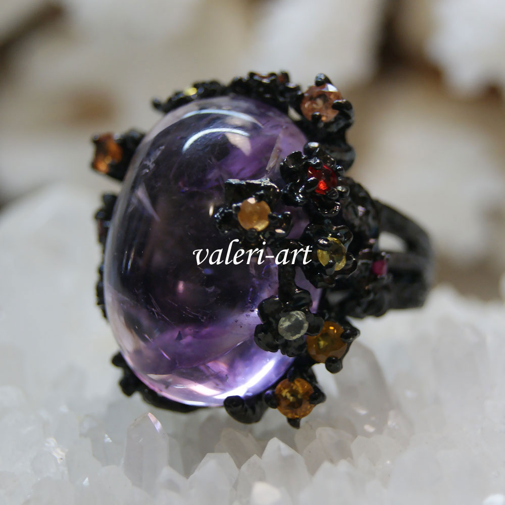 Кольцо с аметистом, цитринами, рубинами, сапфирами из серебра