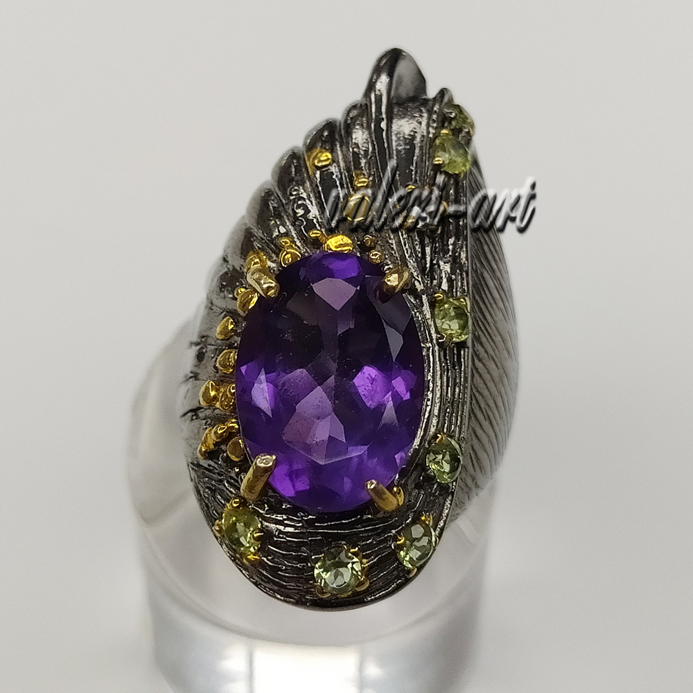 Серебряное авторское кольцо с натуральными аметистами и хризолитами