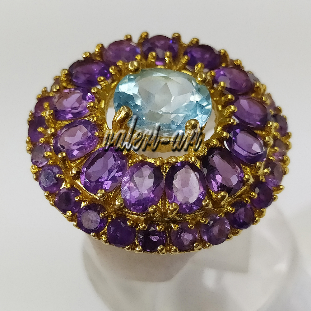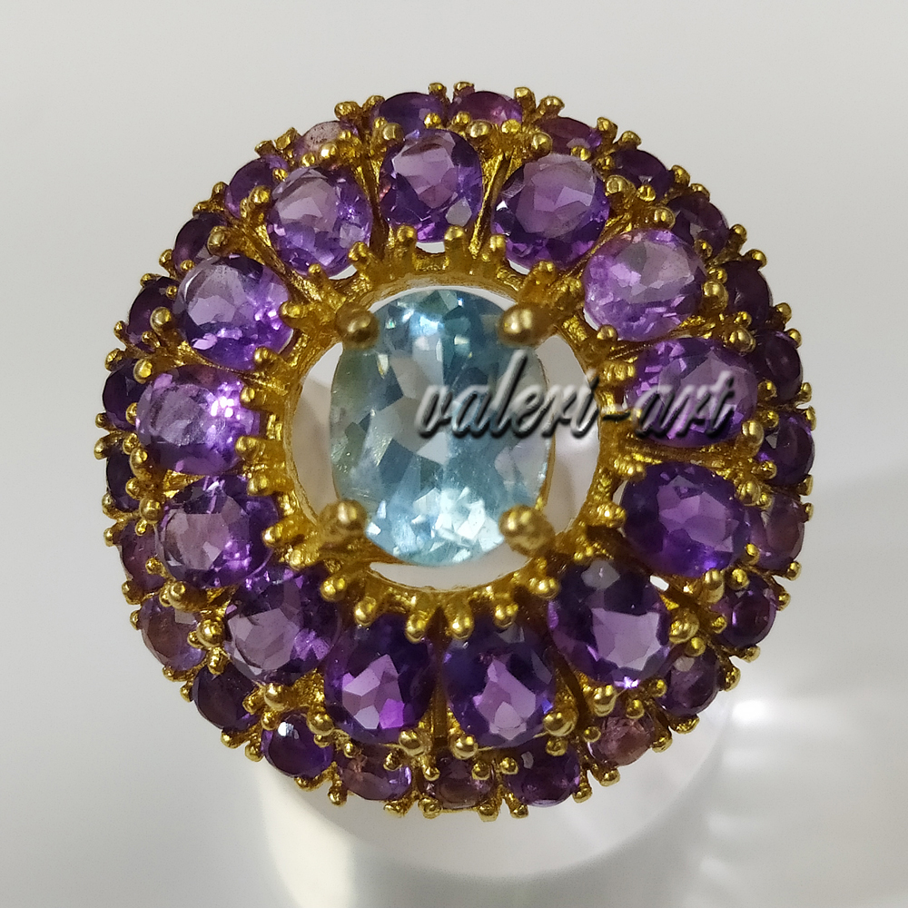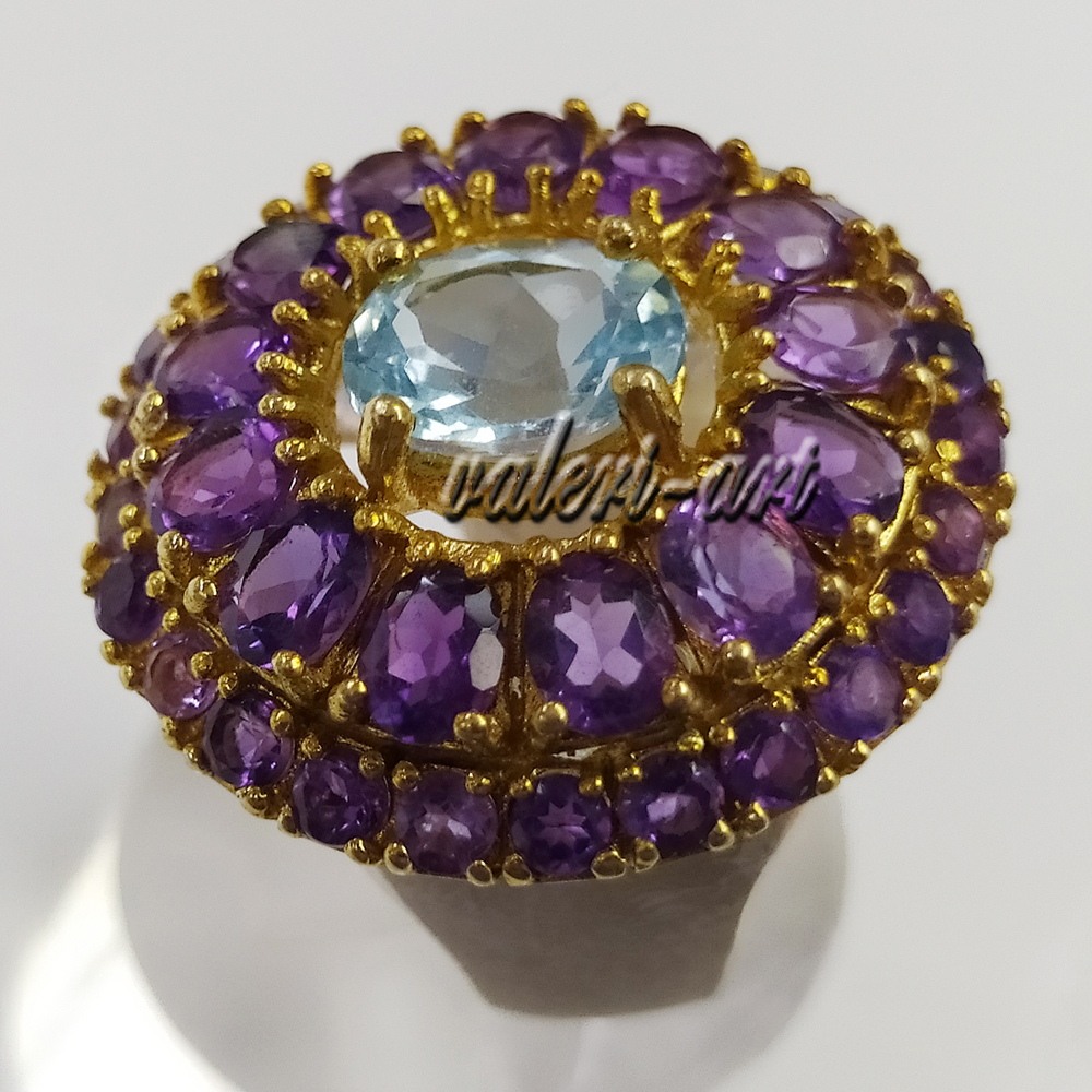 Авторское серебряное кольцо с натуральным голубым топазом и аметистами