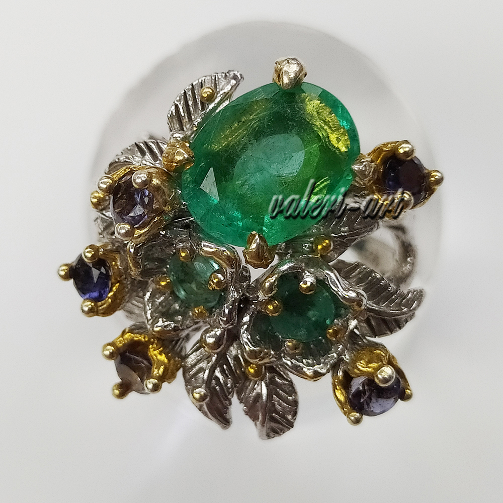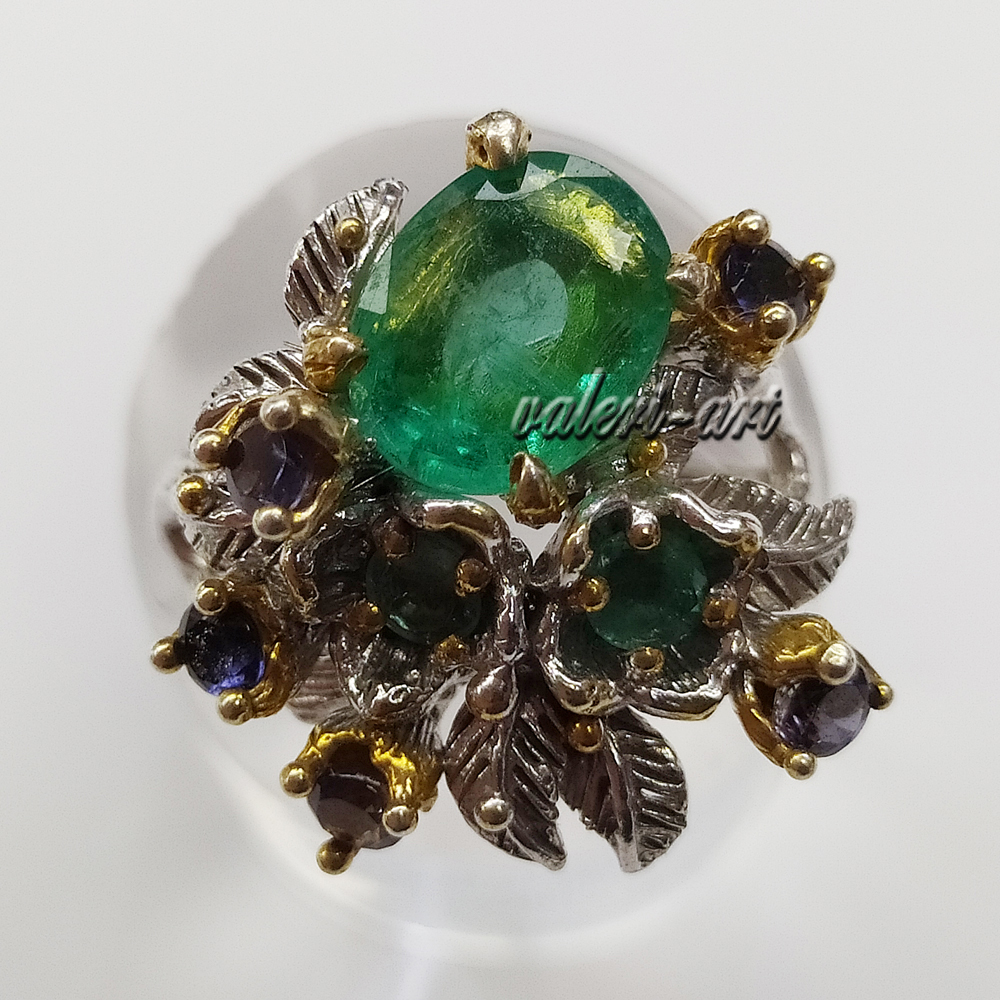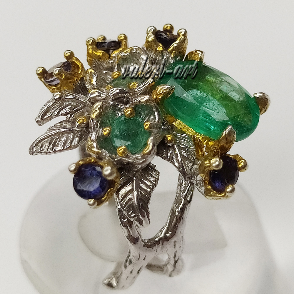 Серебряное авторское кольцо с натуральным природным изумрудом и сапфирами