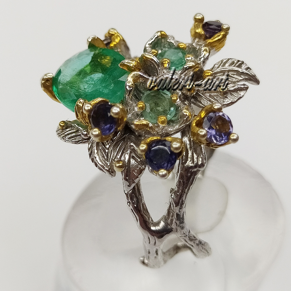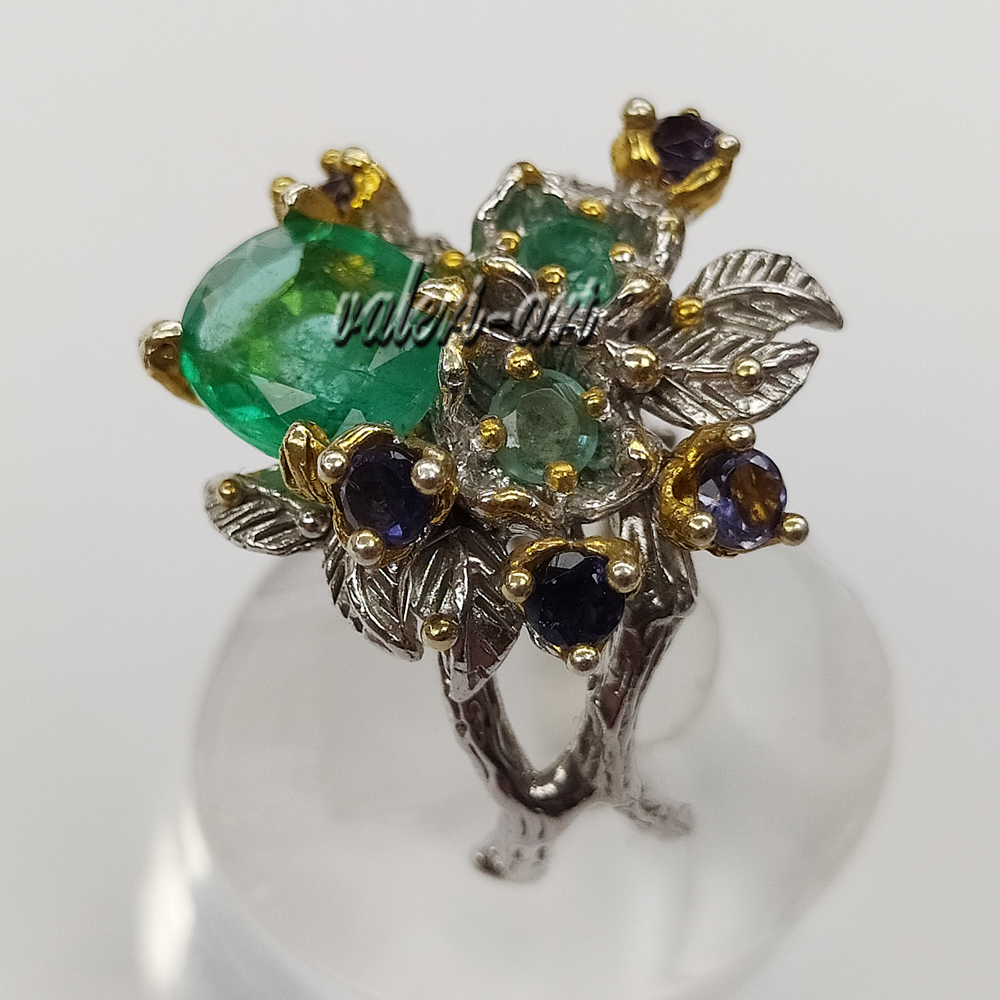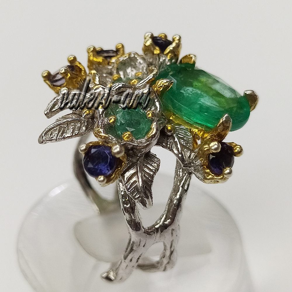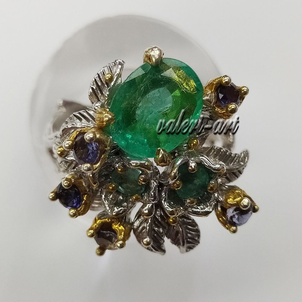 Серебряное авторское кольцо с натуральным природным изумрудом и сапфирами