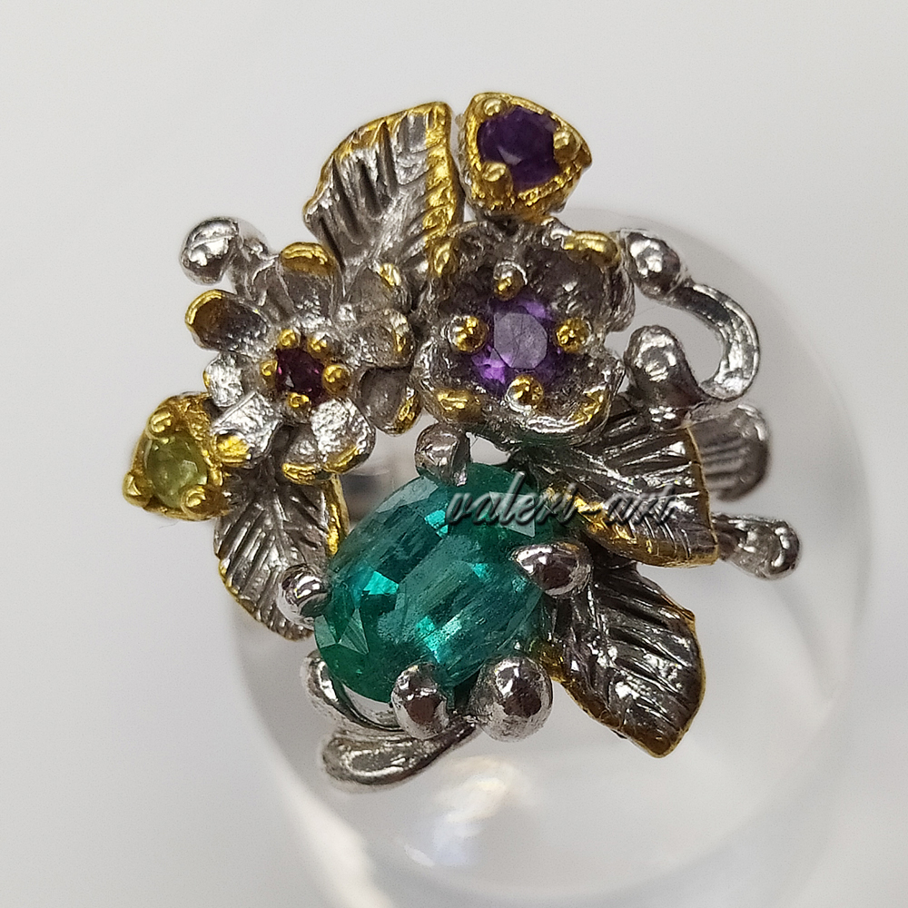 Серебряное авторское кольцо с натуральным природным изумрудом и аметистами и хризолитами
