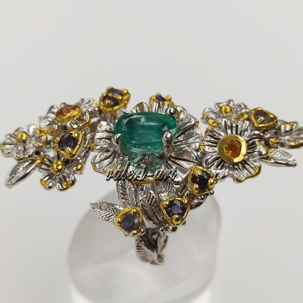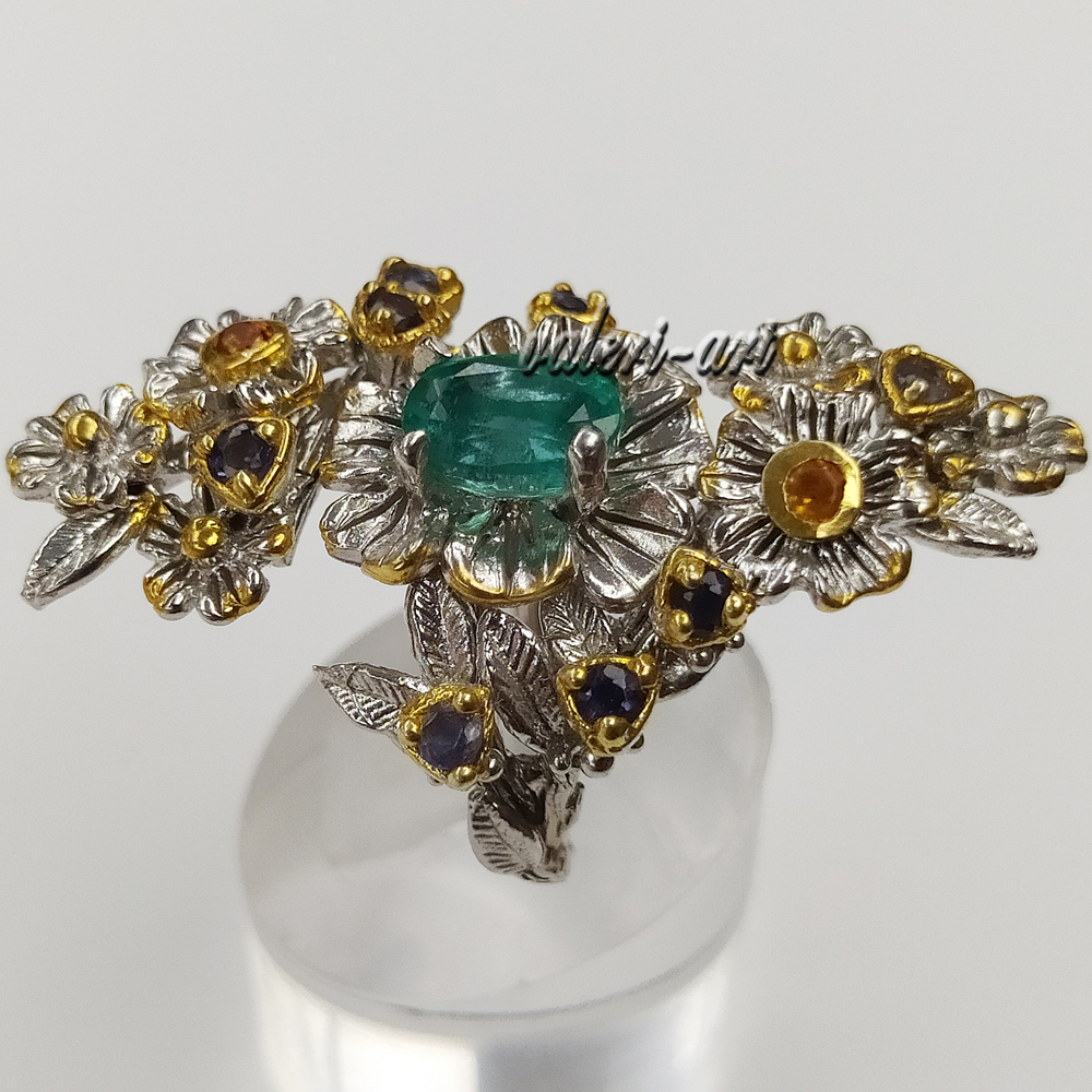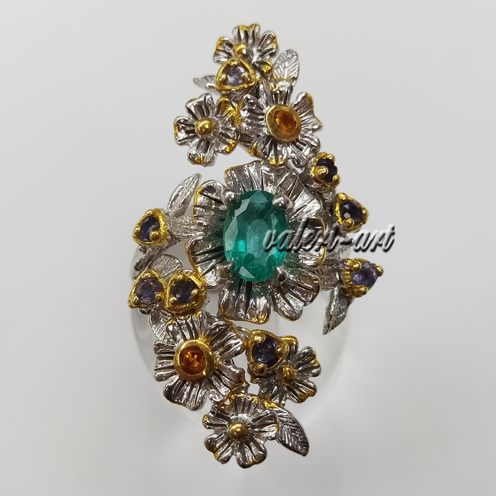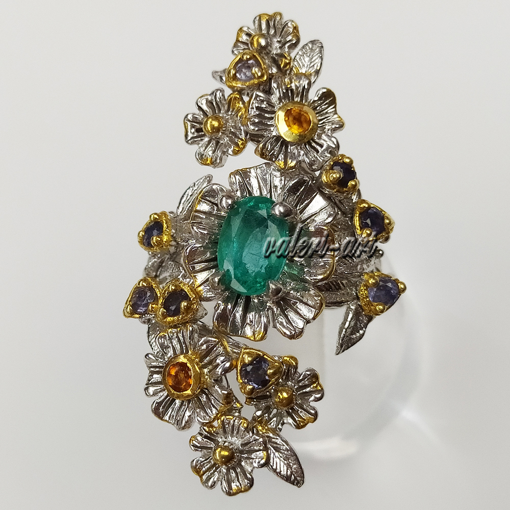 Серебряное авторское кольцо с натуральным природным изумрудом и сапфирами