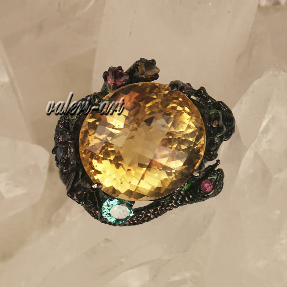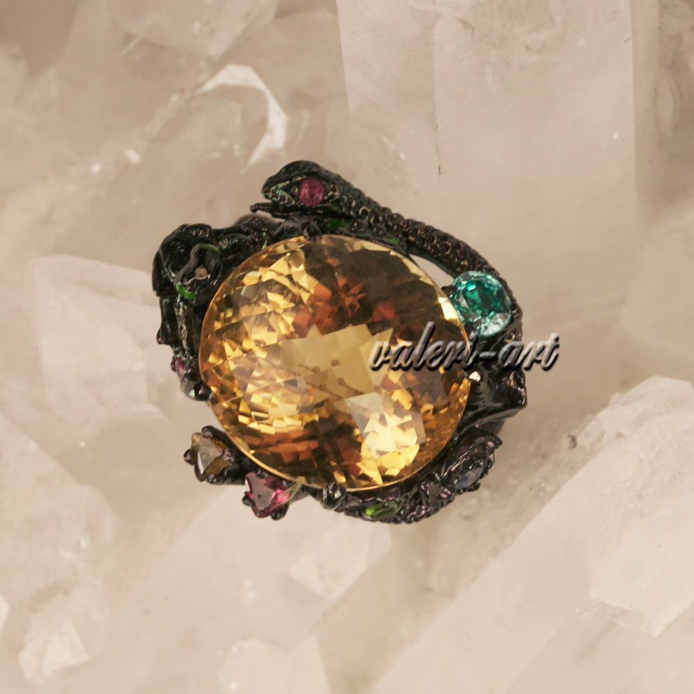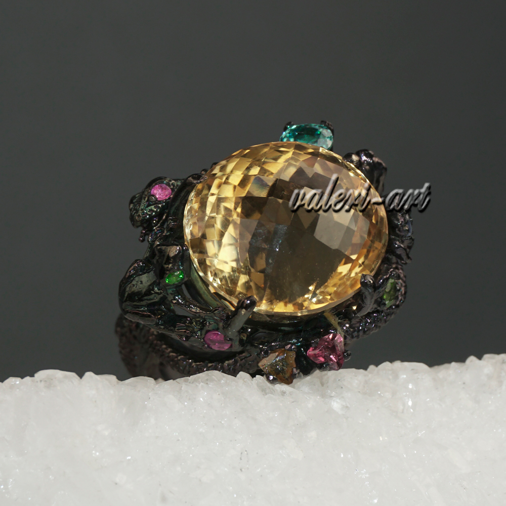 Кольцо с крупным цитрином, голубым топазом, турмалинами из серебра