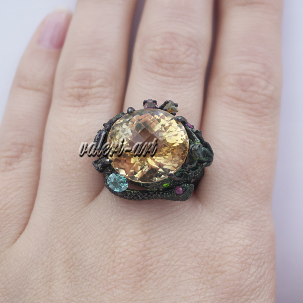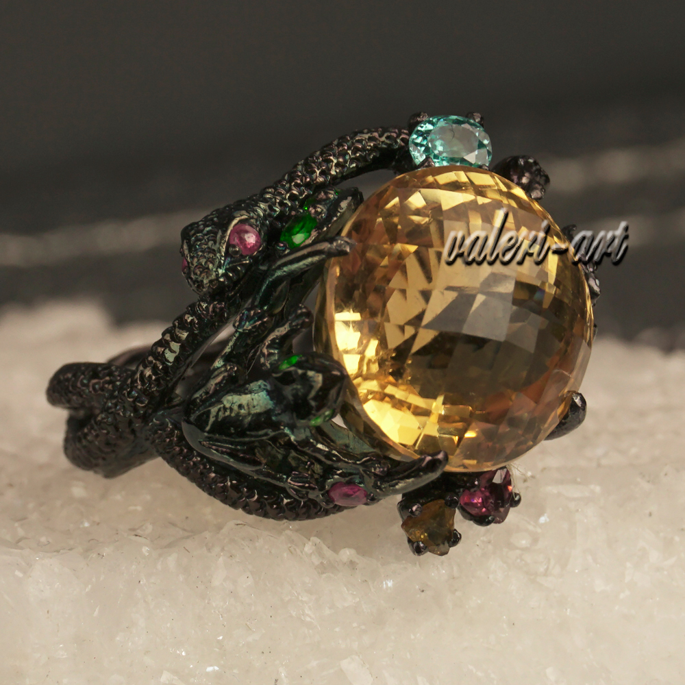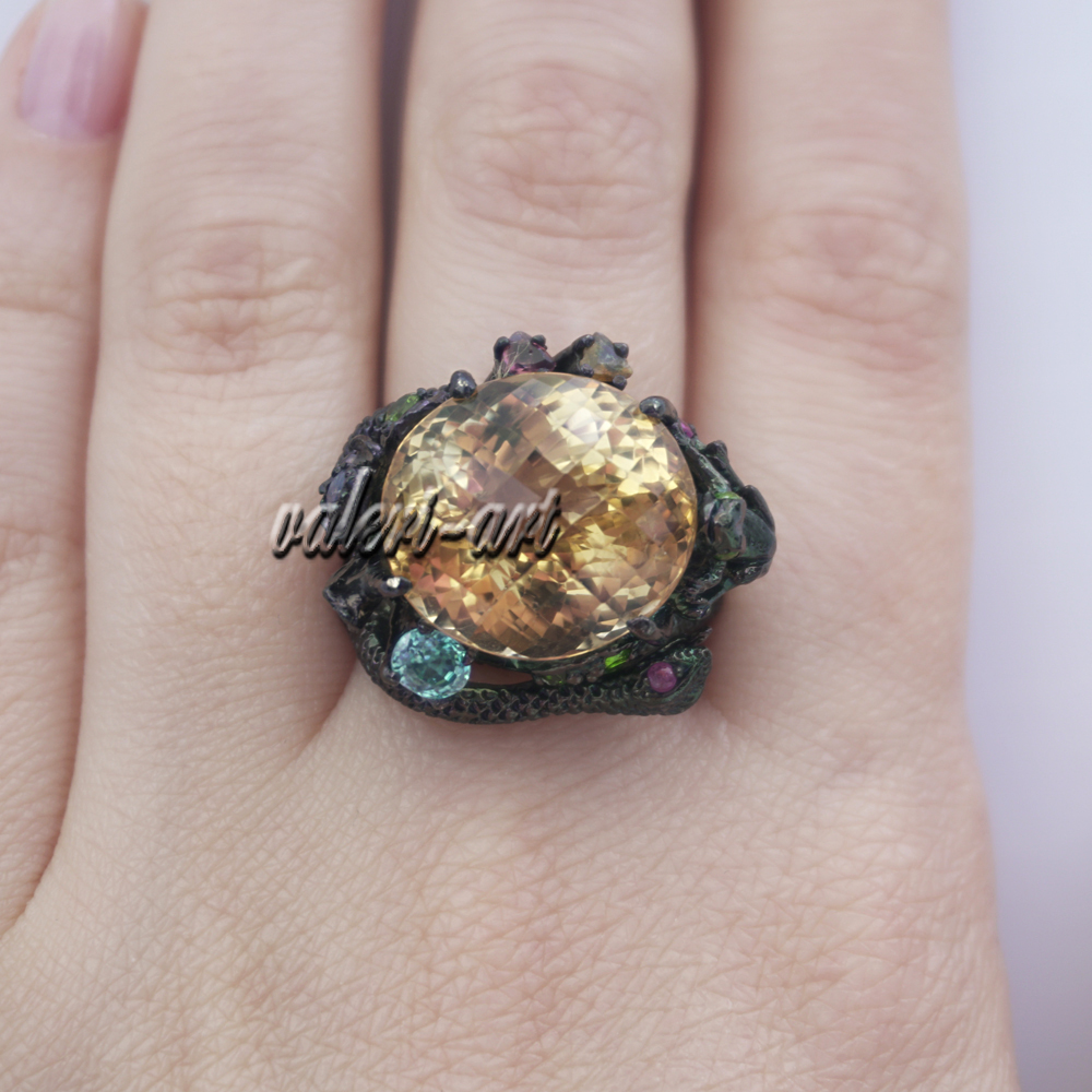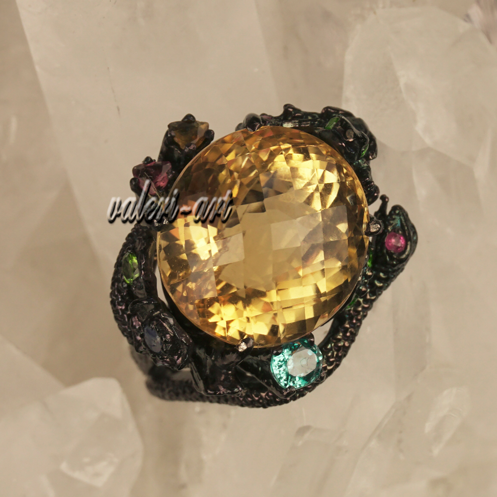 Кольцо с крупным цитрином, голубым топазом, турмалинами из серебра