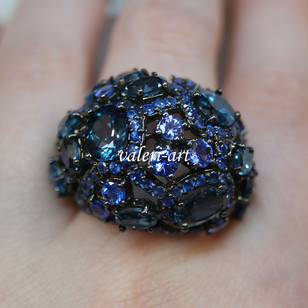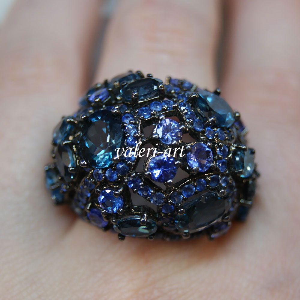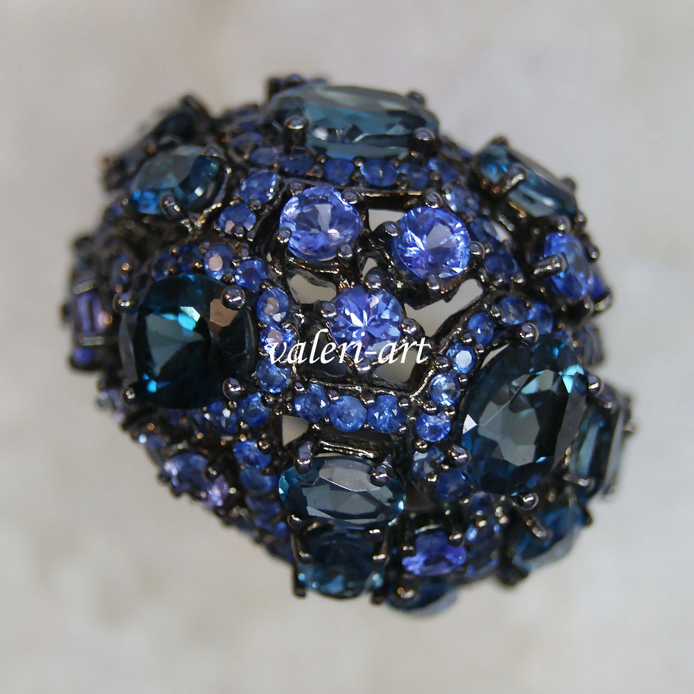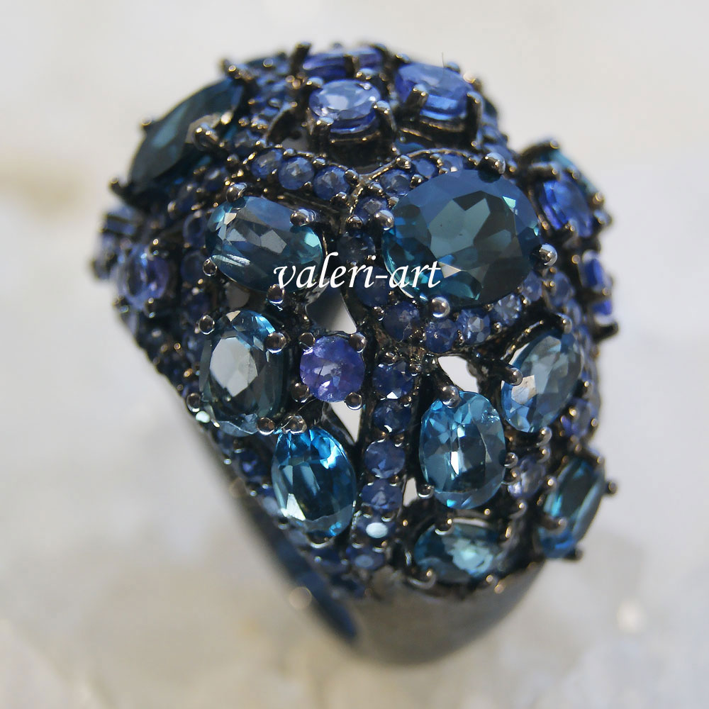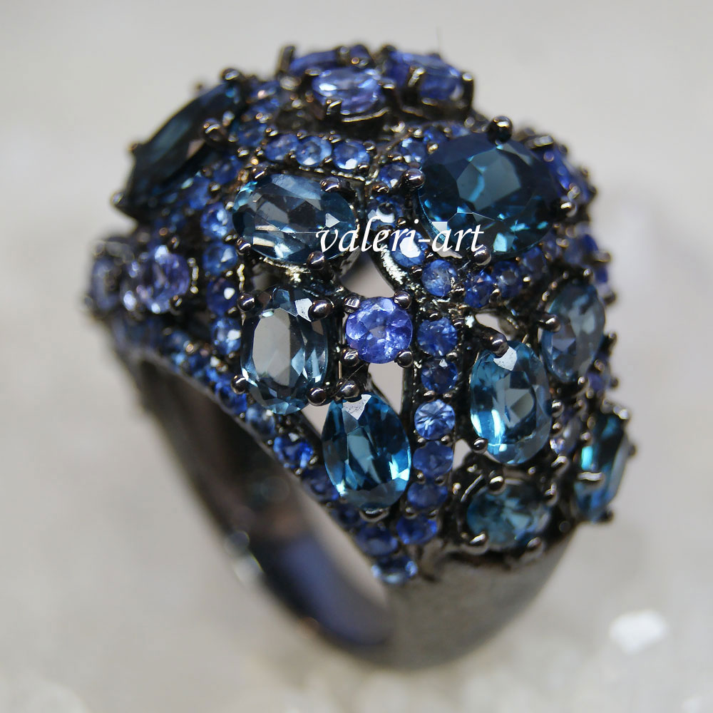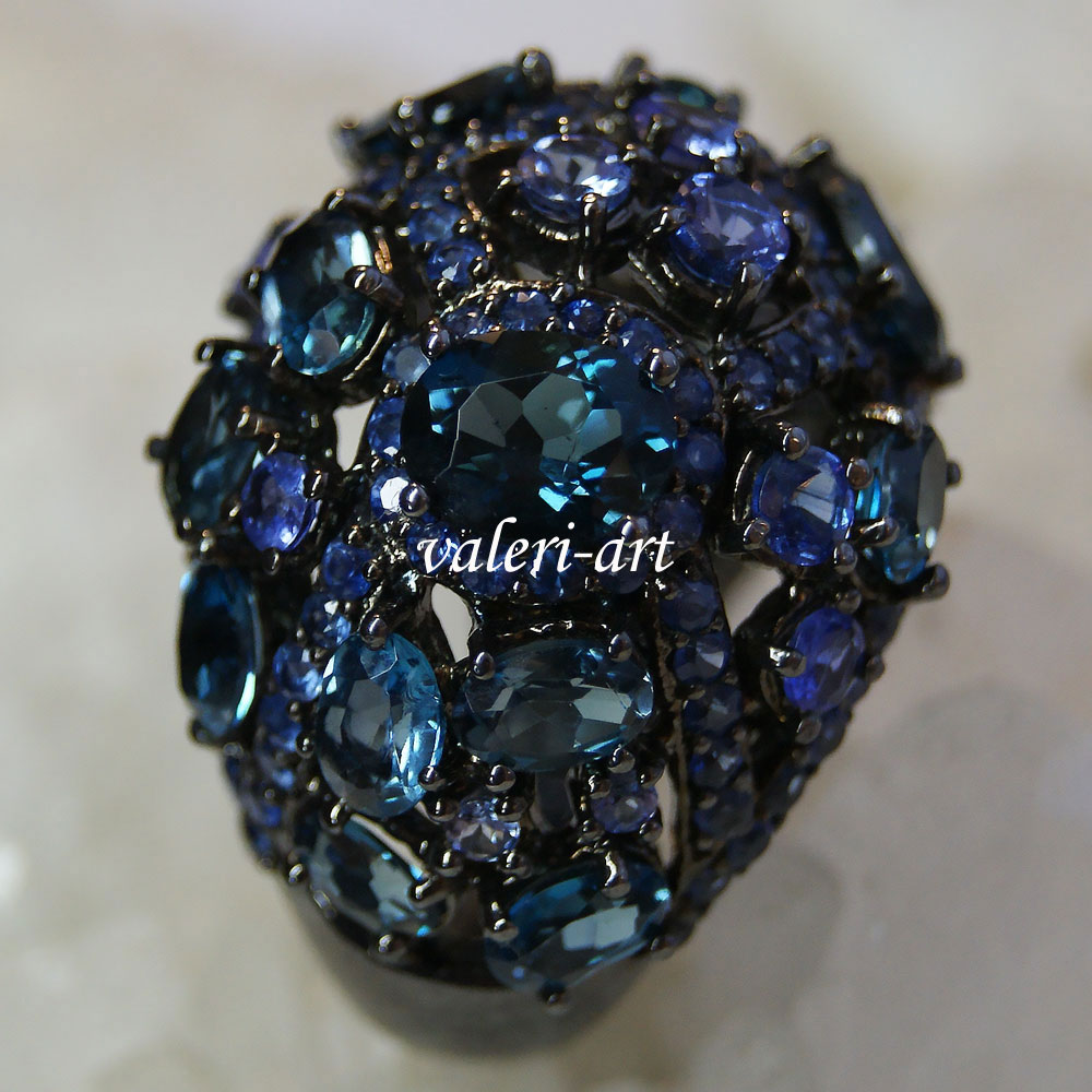 Кольцо с london blue топазами и сапфирами натуральными ААА