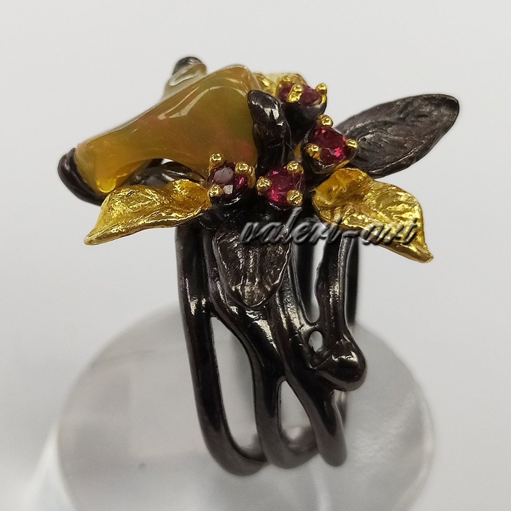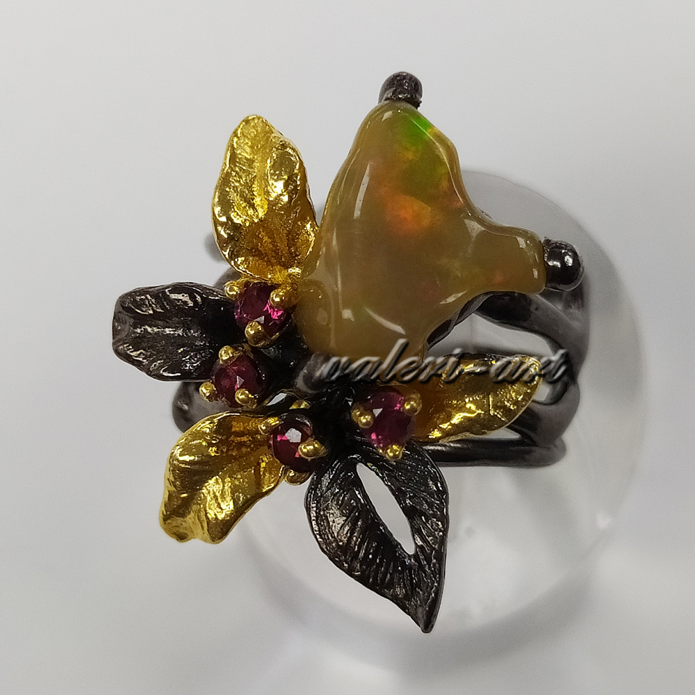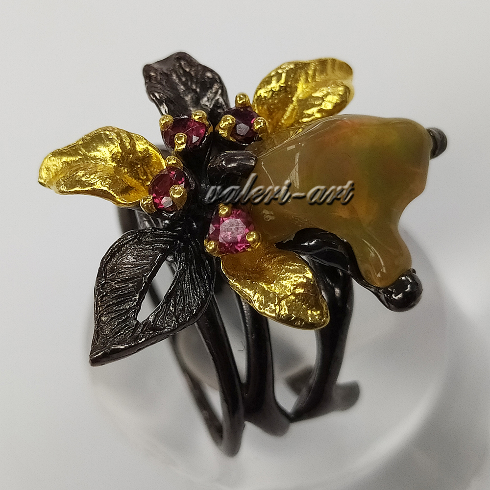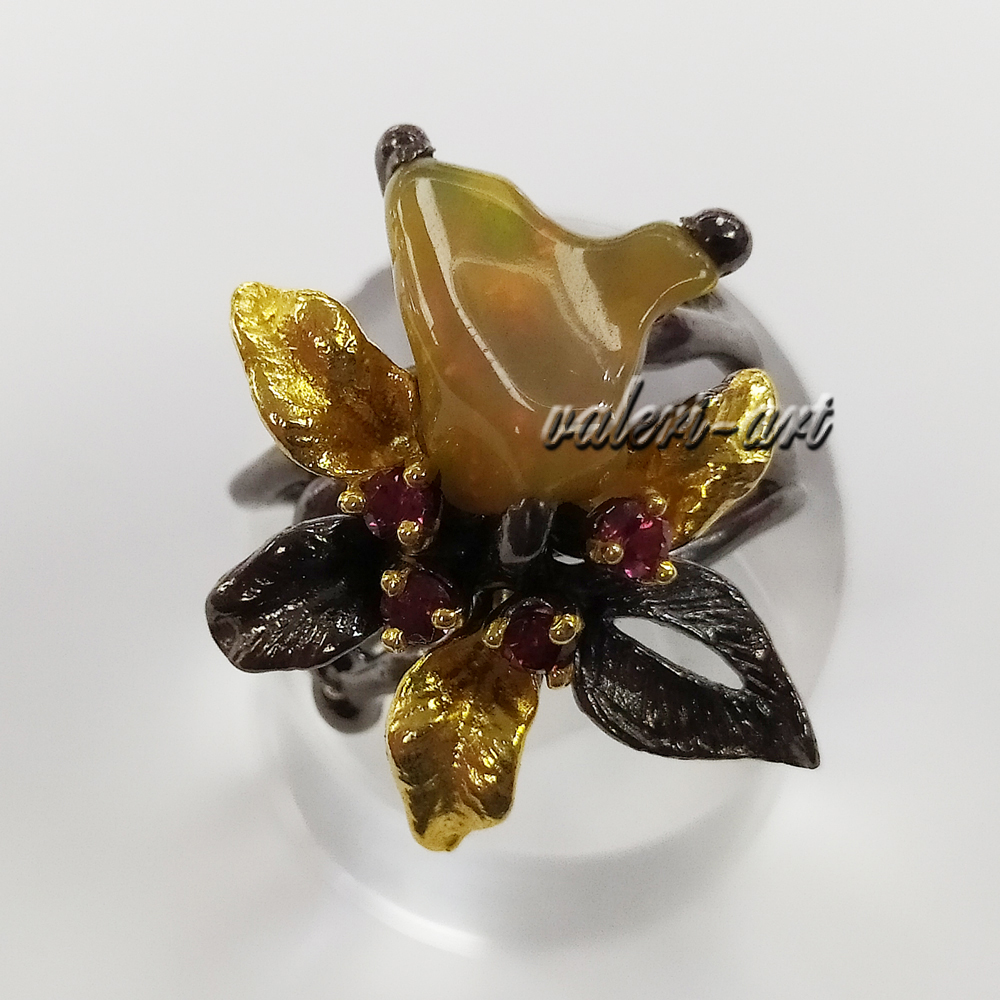 Серебряное авторское кольцо с натуральными опалами и родолитами