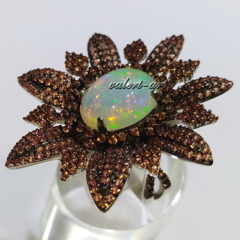серебряное авторское кольцо с натуральным опалом и сапфирами