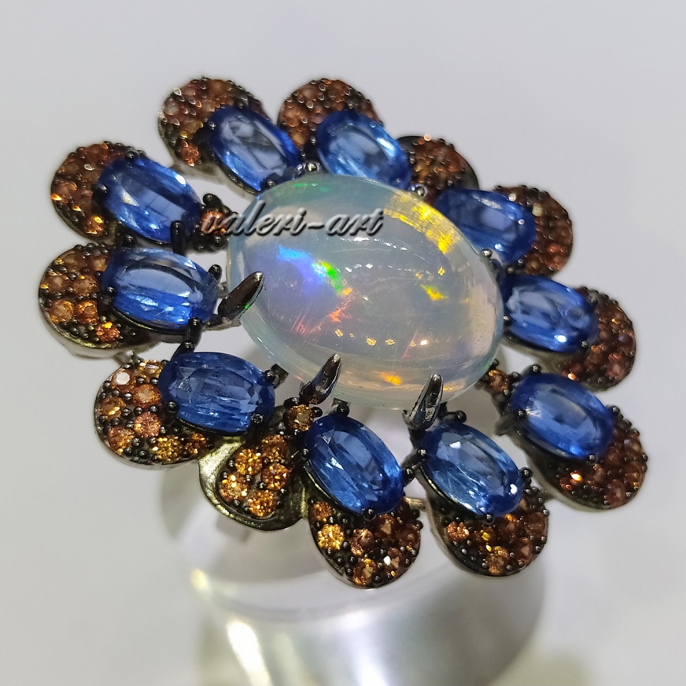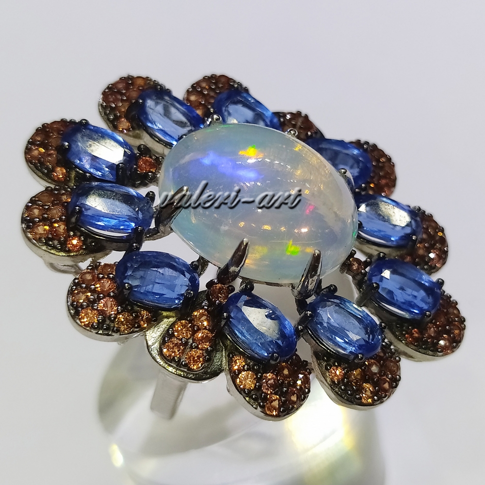 Серебряное авторское кольцо с натуральным опалом, кианитами, сапфирами