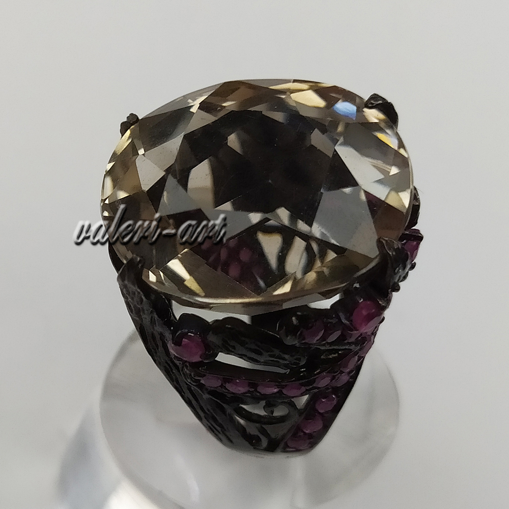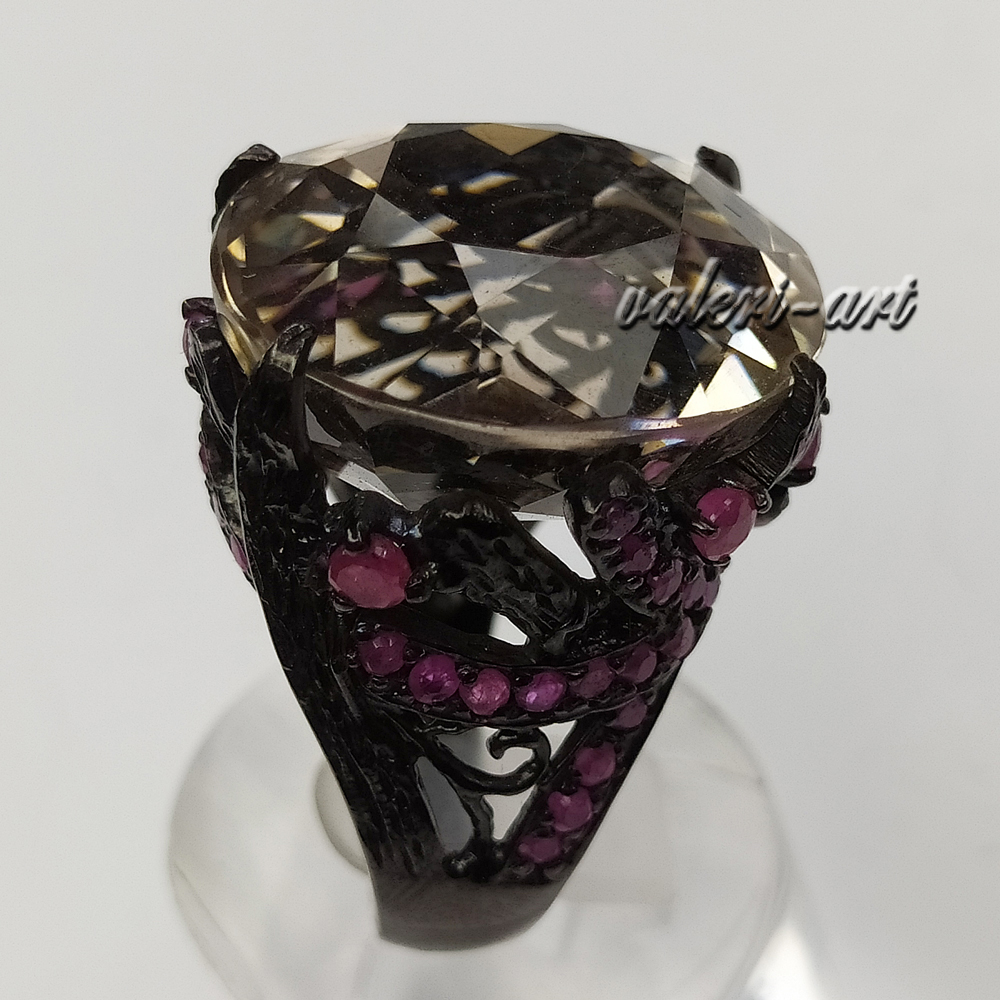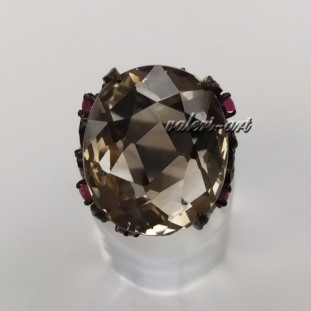 Серебряное авторское кольцо с натуральным раухтопазом и рубинами