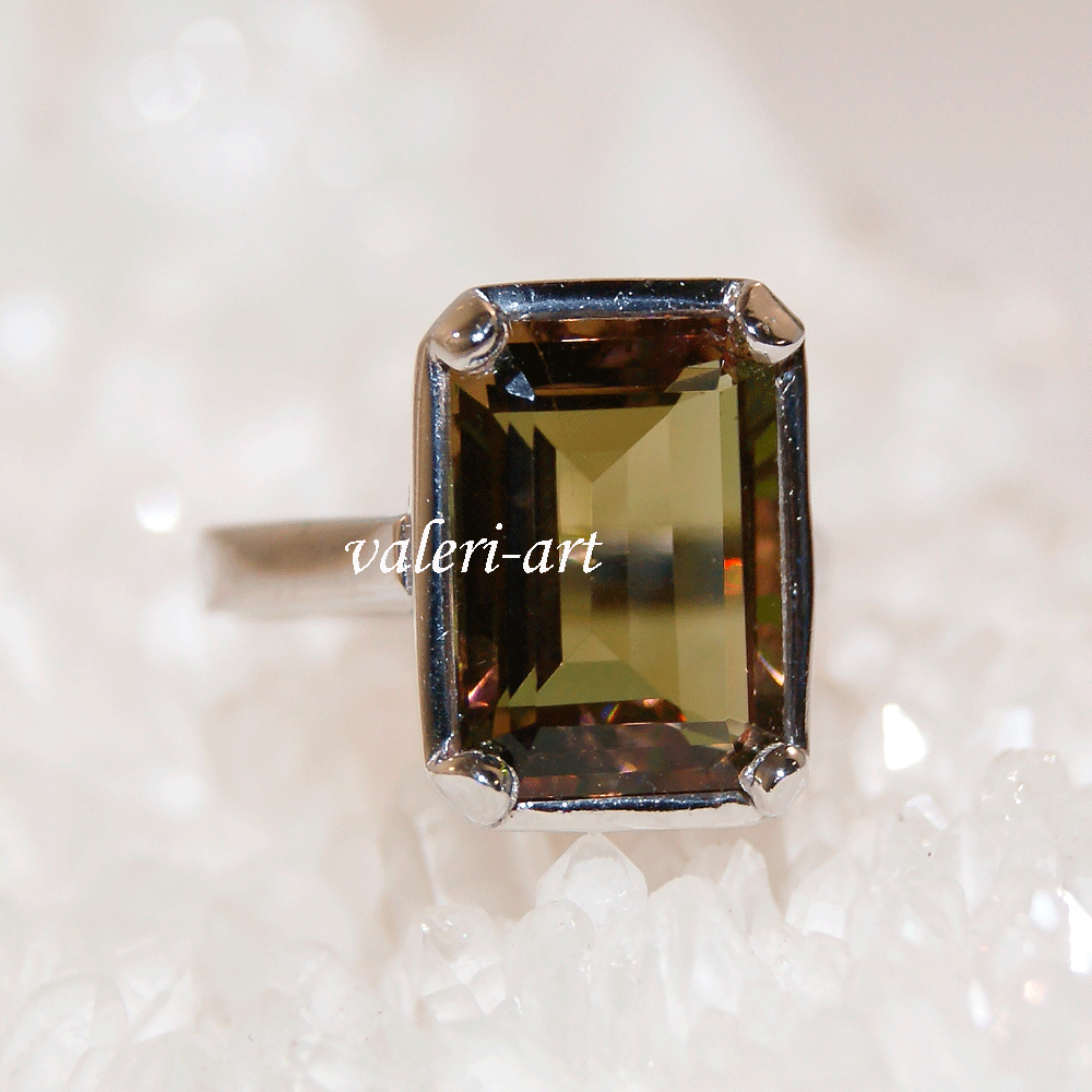 Серебряное кольцо с султанитом г/т. Роскошное кольцо. Очень эффектное, очень яркое украшение из родированного серебра и султанита г/т. Камень меняет свой цвет в зависимости от освещения. Камень то зеленый, то медово-горчичный, то фиолетовый. Идеальный подарок! Способность султанита менять цвет – его главная прелесть и загадка. Известно о таких же свойствах аметиста и александрита, но у нашего камня более разнообразная гамма оттенков. При тусклом освещении или в пасмурный день он зеленый, словно молодая трава. При свете поярче он приобретает коричневые, янтарные, желтые оттенки.