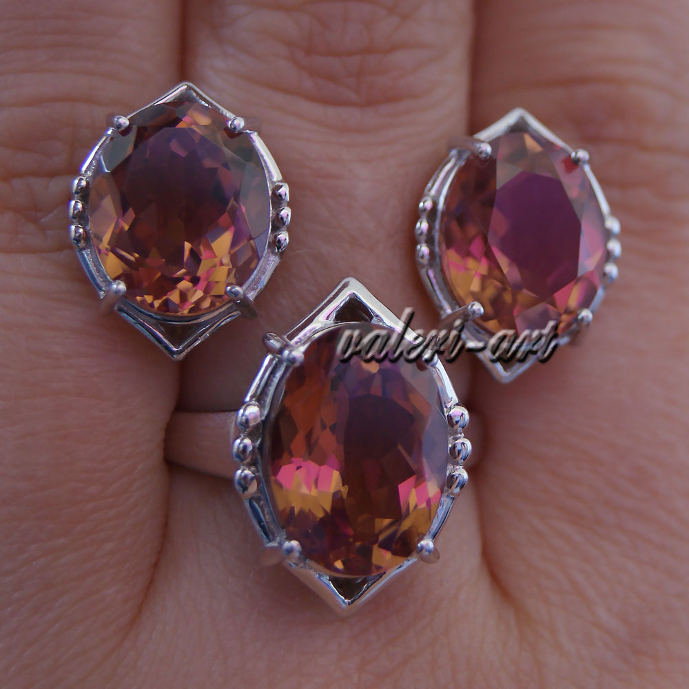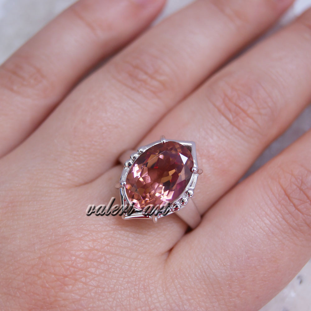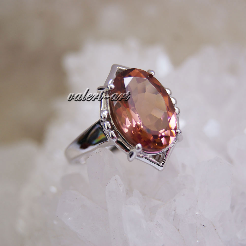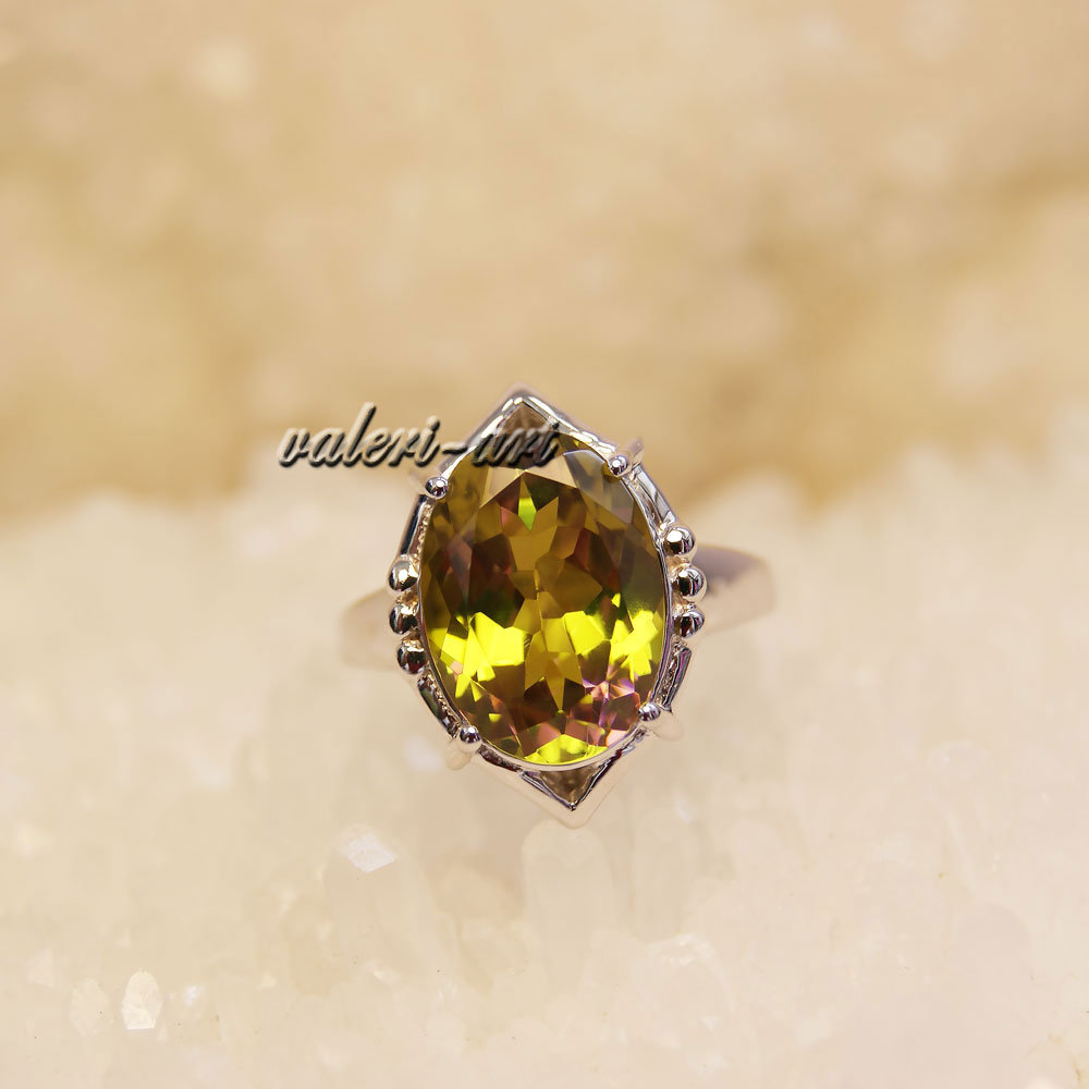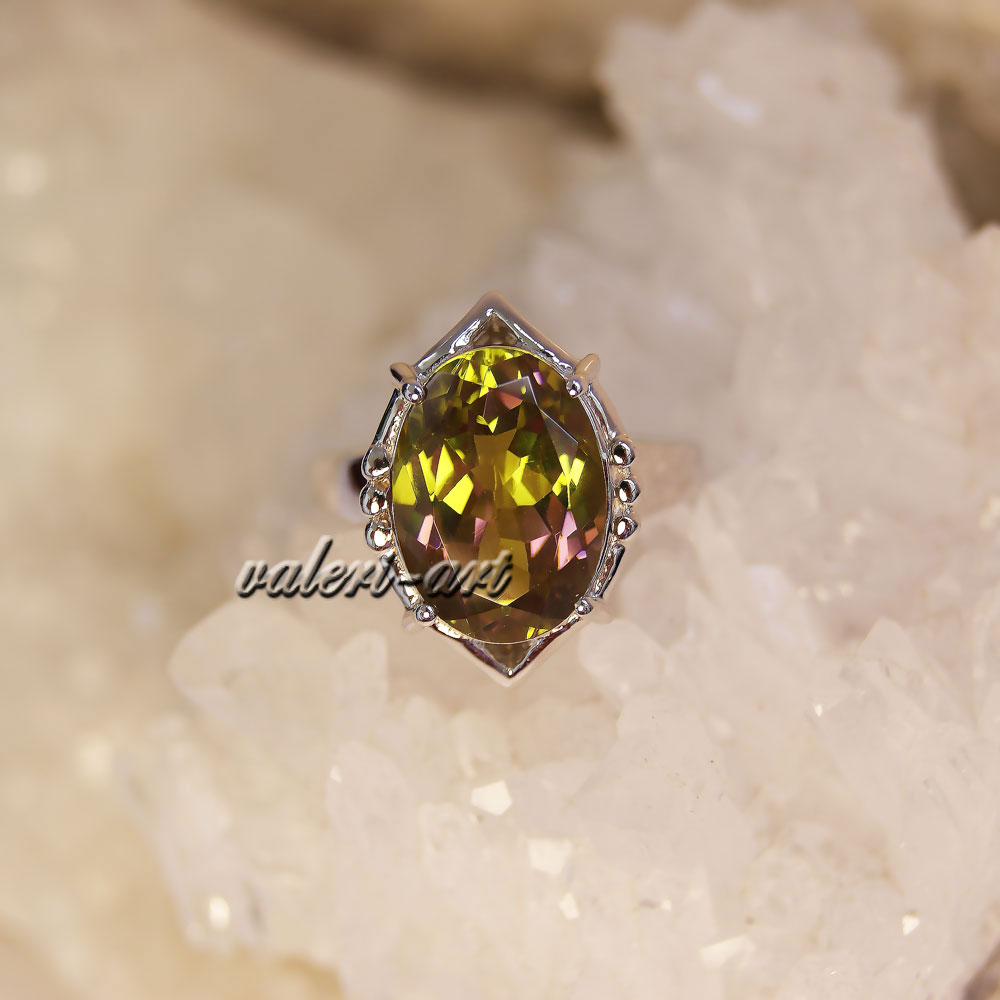 Серебряное кольцо с султанитом г/т. Роскошное кольцо. Очень эффектное, очень яркое украшение из родированного серебра и султанита г/т. Камень меняет свой цвет в зависимости от освещения. Камень то зеленый, то медово-горчичный, то фиолетовый. Идеальный подарок! Способность султанита менять цвет – его главная прелесть и загадка. Известно о таких же свойствах аметиста и александрита, но у нашего камня более разнообразная гамма оттенков. При тусклом освещении или в пасмурный день он зеленый, словно молодая трава. При свете поярче он приобретает коричневые, янтарные, желтые оттенки.
