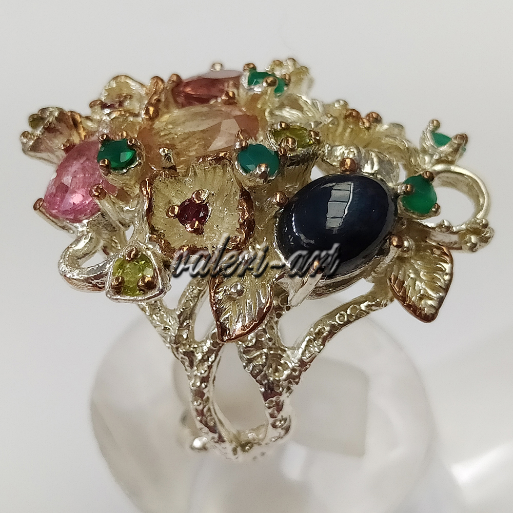 Серебряное авторское кольцо с натуральными турмалинами, изумрудами, гранатами, хризолитами, сапфирами