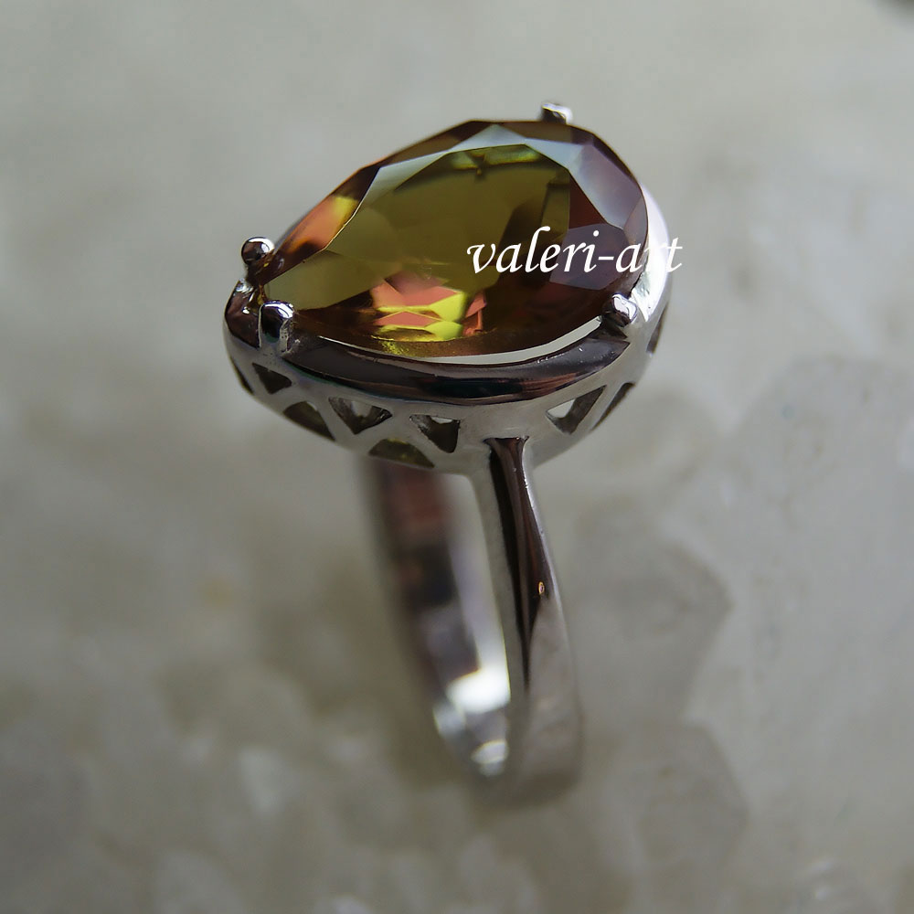 Серебряное кольцо с султанитом г/т. Роскошное кольцо. Очень эффектное, очень яркое украшение из родированного серебра и султанита г/т. Камень меняет свой цвет в зависимости от освещения. Камень то зеленый, то медово-горчичный, то фиолетовый. Идеальный подарок! Способность султанита менять цвет – его главная прелесть и загадка. Известно о таких же свойствах аметиста и александрита, но у нашего камня более разнообразная гамма оттенков. При тусклом освещении или в пасмурный день он зеленый, словно молодая трава. При свете поярче он приобретает коричневые, янтарные, желтые оттенки.