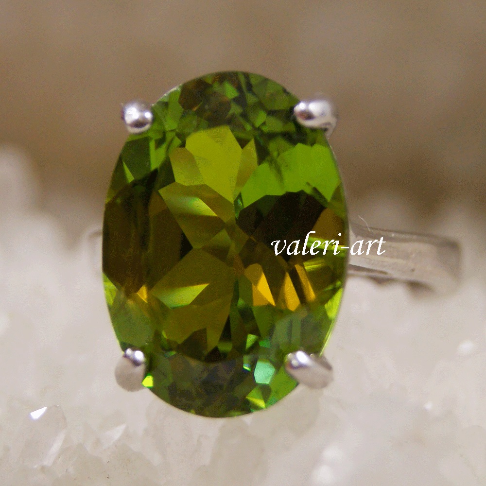 Серебряное кольцо с султанитом г/т. Роскошное кольцо. Очень эффектное, очень яркое украшение из родированного серебра и султанита г/т. Камень меняет свой цвет в зависимости от освещения. Камень то зеленый, то медово-горчичный, то фиолетовый. Идеальный подарок! Способность султанита менять цвет – его главная прелесть и загадка. Известно о таких же свойствах аметиста и александрита, но у нашего камня более разнообразная гамма оттенков. При тусклом освещении или в пасмурный день он зеленый, словно молодая трава. При свете поярче он приобретает коричневые, янтарные, желтые оттенки.