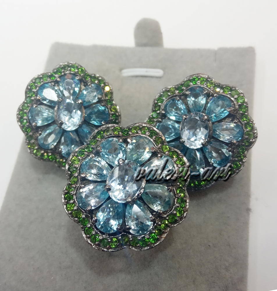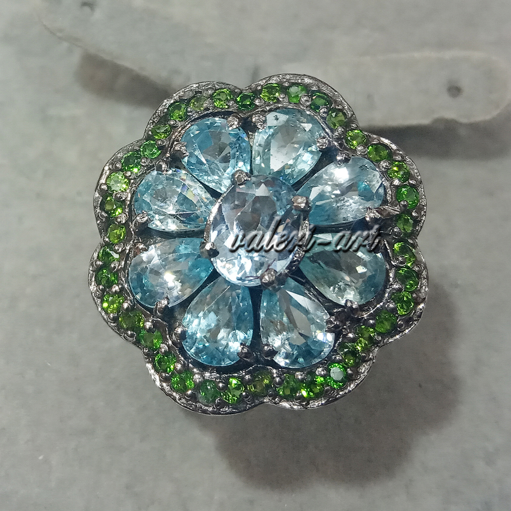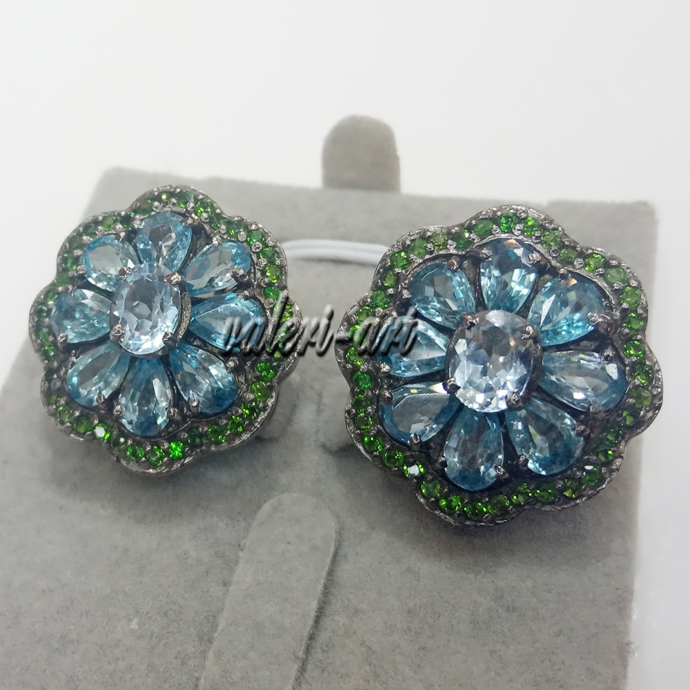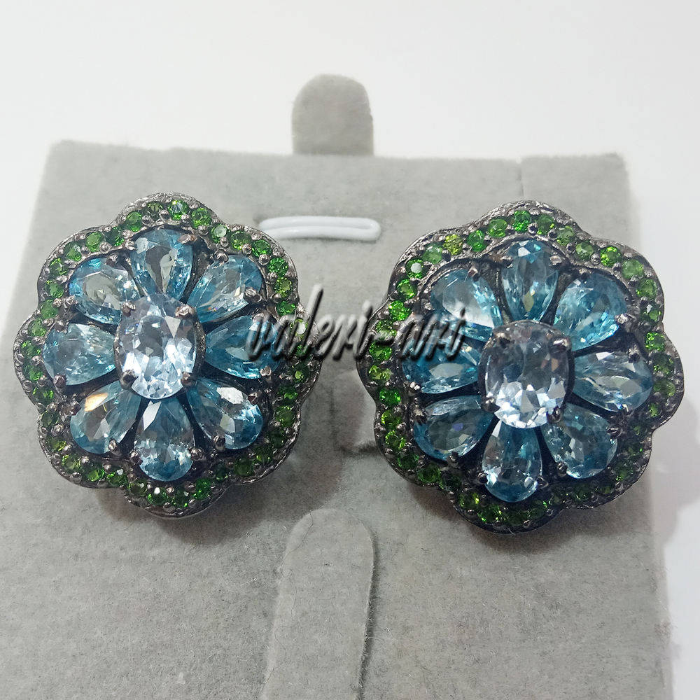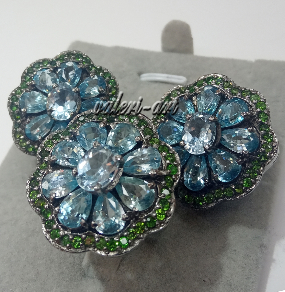 Серебряный комплект с натуральными голубыми топазами и хромдиопсидами