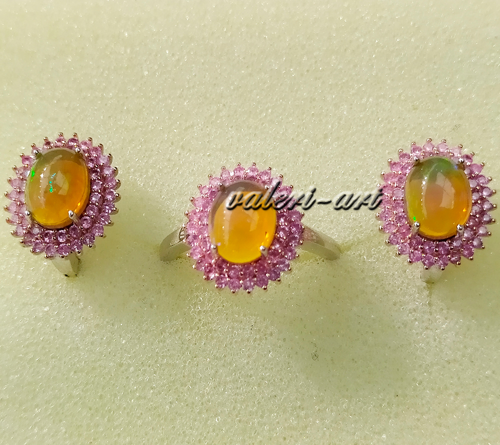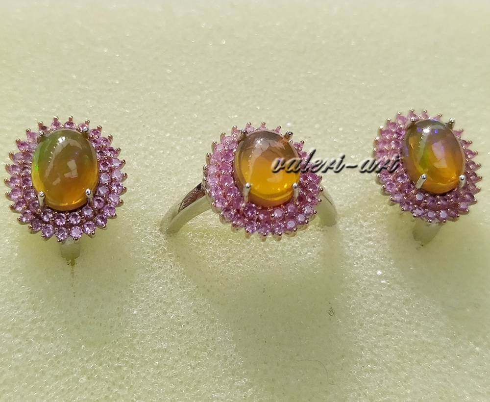 Серебряный комплект с натуральным опалом и розовым сапфиром
