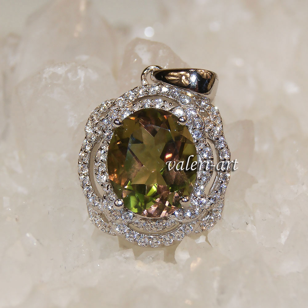 Серебряный кулон с султанитом г/т. Очень эффектное, очень яркое украшение из родированного серебра и султанита г/т. Камень меняет свой цвет в зависимости от освещения. Камень то зеленый, то медово-горчичный, то фиолетовый. Идеальный подарок! Способность султанита менять цвет – его главная прелесть и загадка. Известно о таких же свойствах аметиста и александрита, но у нашего камня более разнообразная гамма оттенков. При тусклом освещении или в пасмурный день он зеленый, словно молодая трава. При свете поярче он приобретает коричневые, янтарные, желтые оттенки.