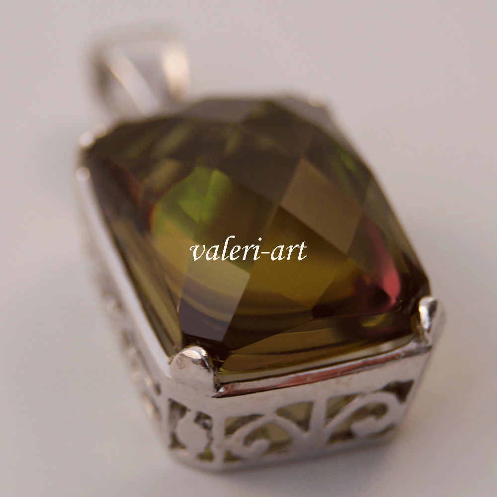 Серебряный кулон с султанитом г/т. Очень эффектное, очень яркое украшение из родированного серебра и султанита г/т. Камень меняет свой цвет в зависимости от освещения. Камень то зеленый, то медово-горчичный, то фиолетовый. Идеальный подарок! Способность султанита менять цвет – его главная прелесть и загадка. Известно о таких же свойствах аметиста и александрита, но у нашего камня более разнообразная гамма оттенков. При тусклом освещении или в пасмурный день он зеленый, словно молодая трава. При свете поярче он приобретает коричневые, янтарные, желтые оттенки.
