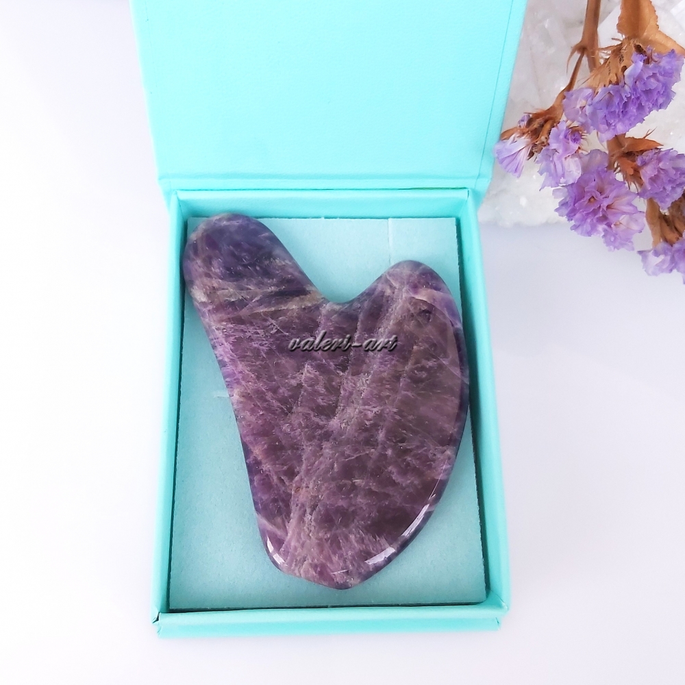 Пластина (скребок) гуаша в форме сердца из натурального аметиста для массажа лица и шеи. Обеспечивает разглаживание мимических машин, расслабление мышц лица и шей, повышает эластичность кожи, уменьшает отечность, нормализует водный баланс клеток и удаление токсинов, за счет воздействия на биологически активные точки на лице, массаж гуаша позволяет влиять не только на тонус и состояние кожи, но и на общее состояние организма.