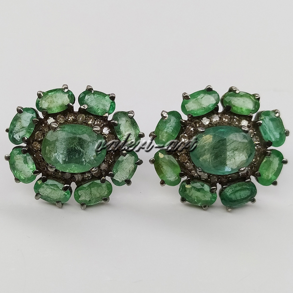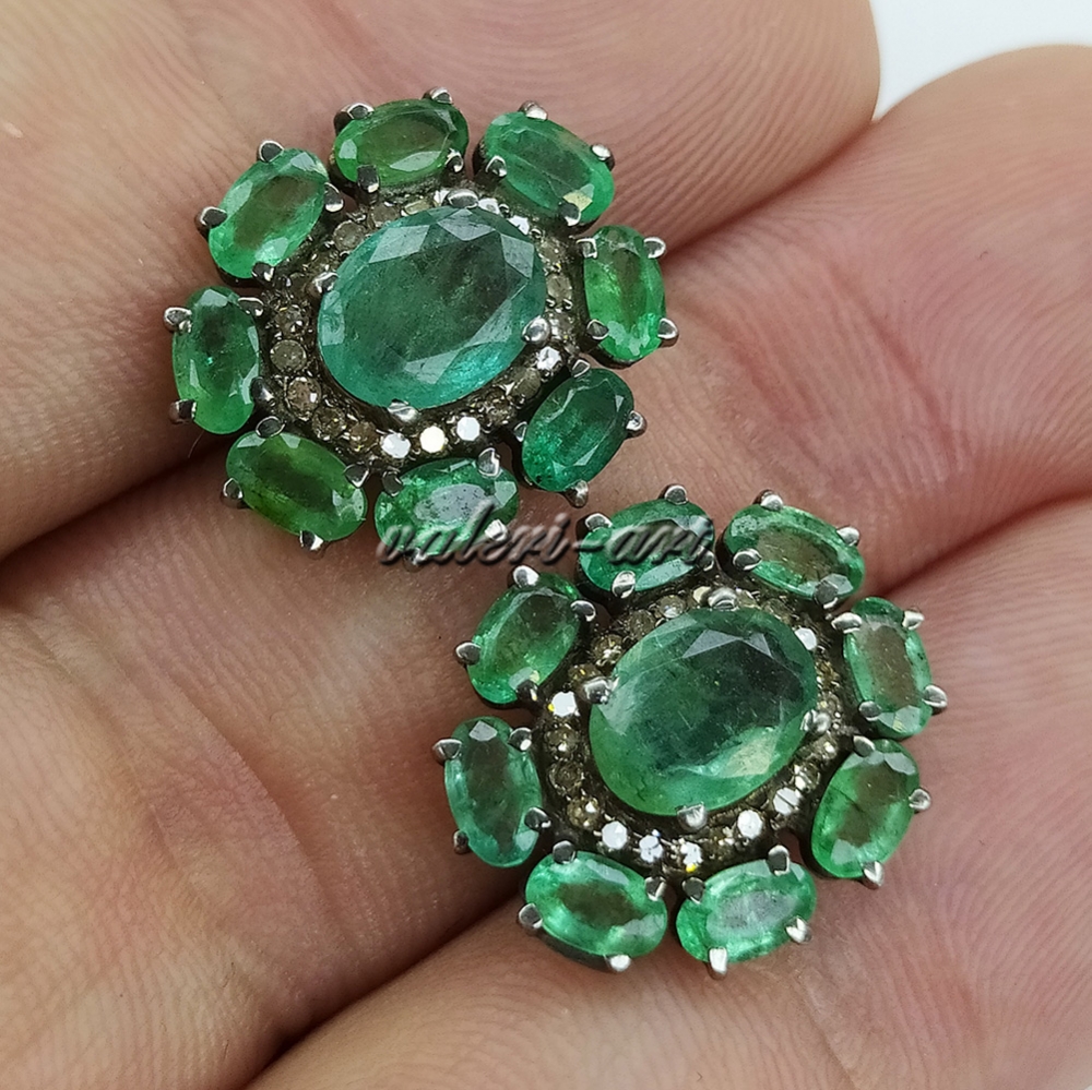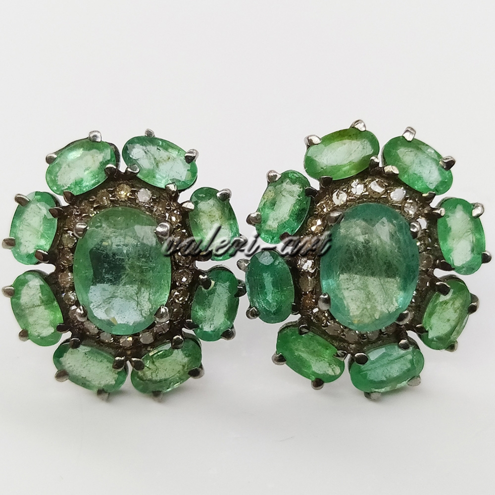 Серебряный серьги гвоздики с натуральными изумрудами и бриллиантами