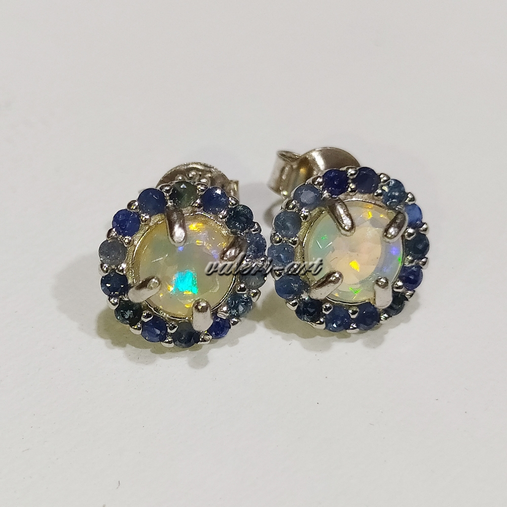 Серьги гвоздики с опалом и сапфирами