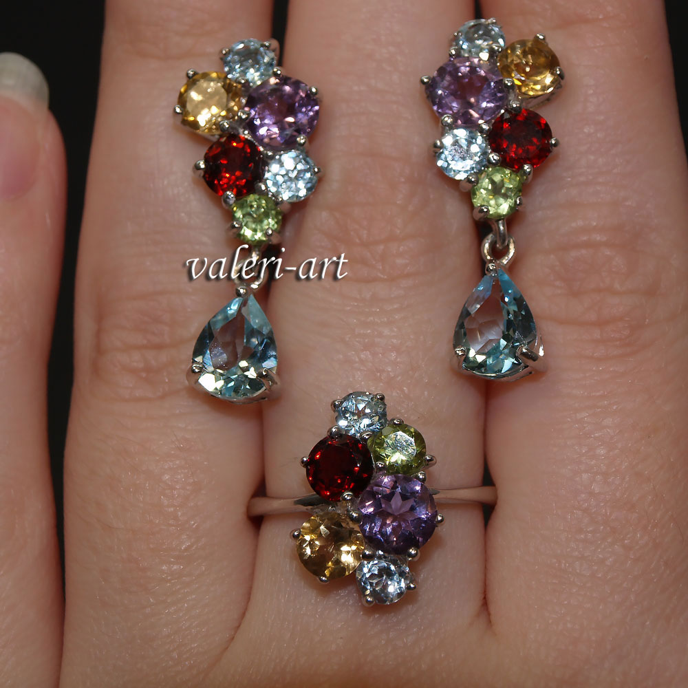Серьги с голубым топазом, гранатом, цитрином, аметистом, хризолитом в серебре 925 пробы.
