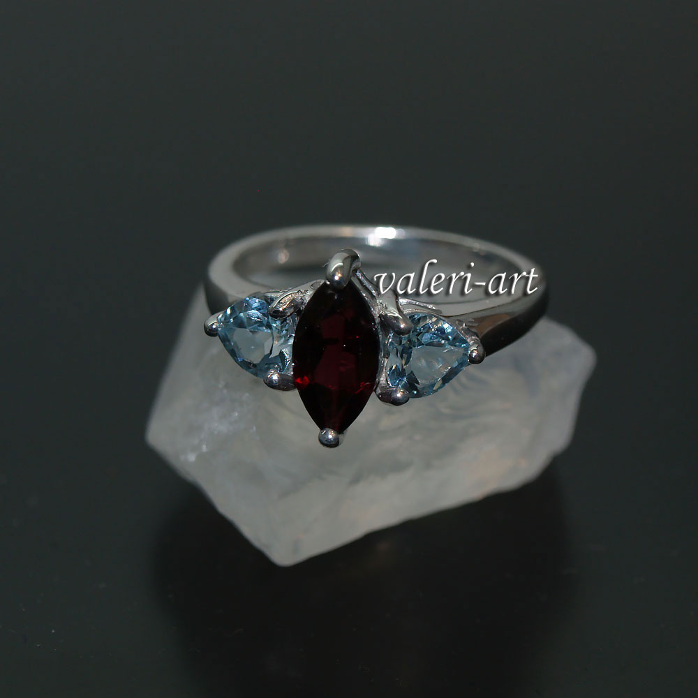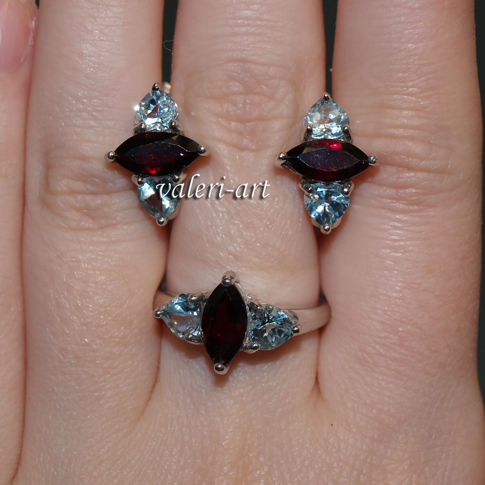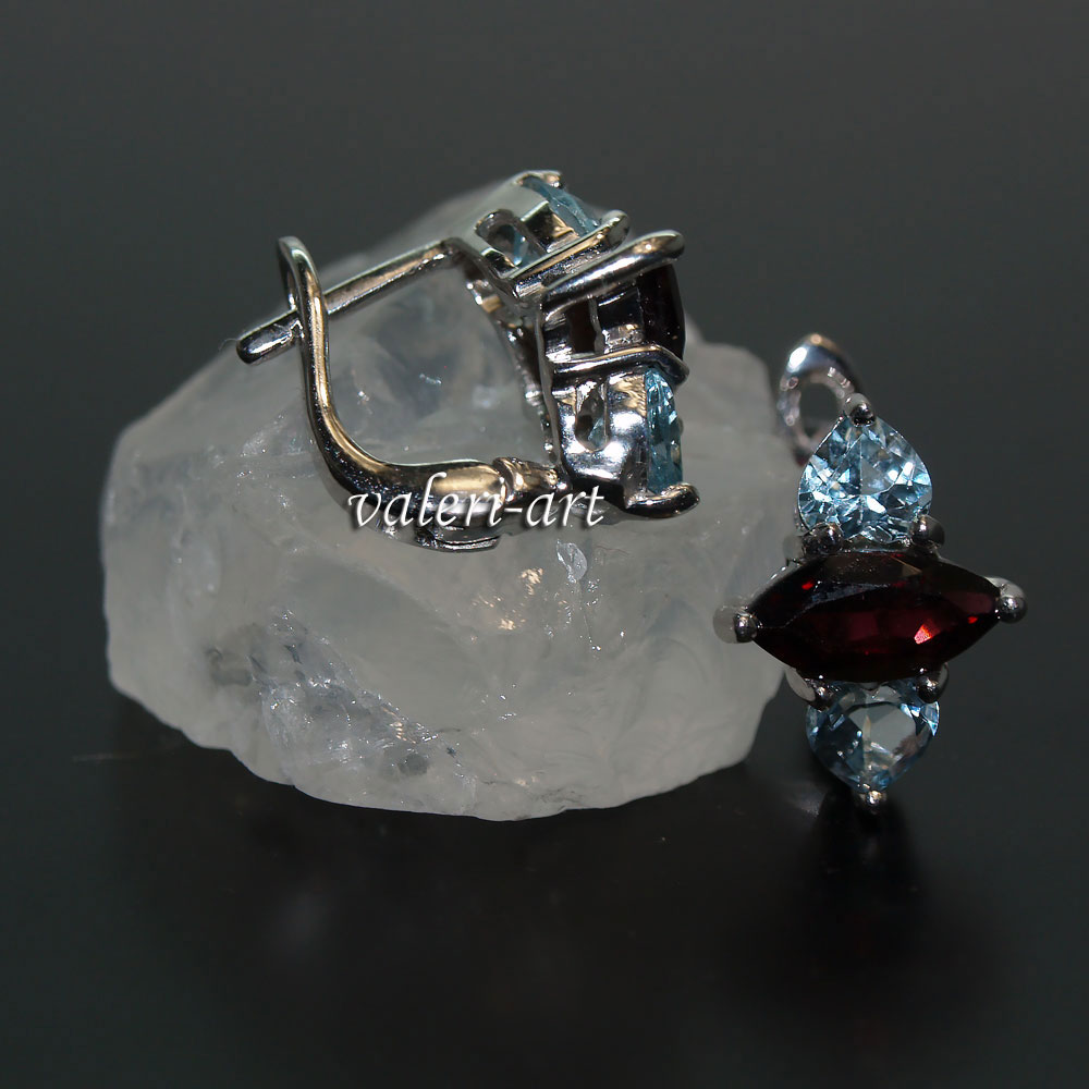 Серьги с голубым топазом и гранатом в серебре 925 пробы. Украшения из граната и голубого топаза