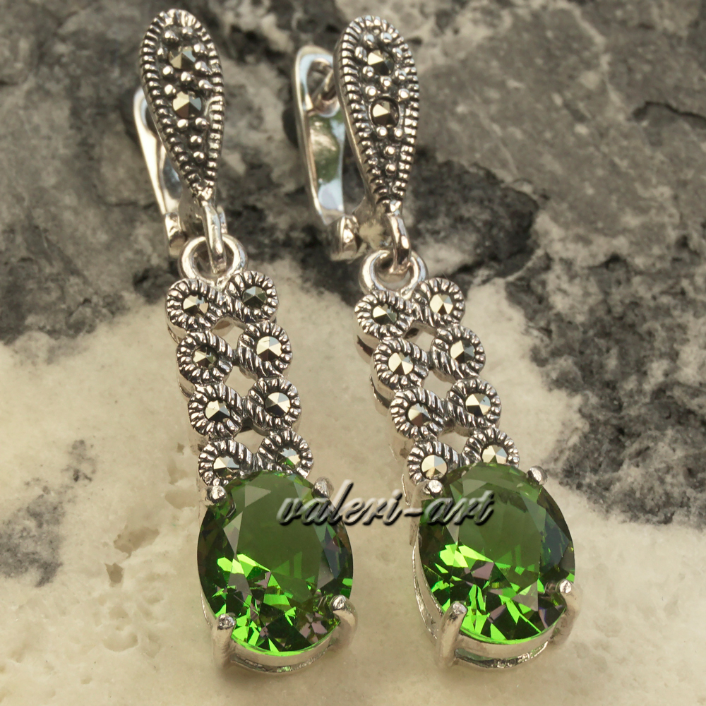 Купить серьги с султанитами и марказитами в ювелирном бутике Valeri-Art в Москве по сниженным ценам. Большой выбор серёг с султанитом и марказитом с актуальными фото. Скидки до -30% при покупке полного комплекта. Серебряные серьги с султанитом г/т и марказитом. Роскошные серьги султанит и марказит в серебре. Очень эффектное, очень яркое украшение серьги из родированного серебра и султанита г/т и марказитами. Камень меняет свой цвет в зависимости от освещения. Камень то зеленый, то медово-горчичный, то фиолетовый. Идеальный подарок! Способность султанита менять цвет – его главная прелесть и загадка. Известно о таких же свойствах аметиста и александрита, но у нашего камня более разнообразная гамма оттенков. При тусклом освещении или в пасмурный день он зеленый, словно молодая трава. При свете поярче он приобретает коричневые, янтарные, желтые оттенки.