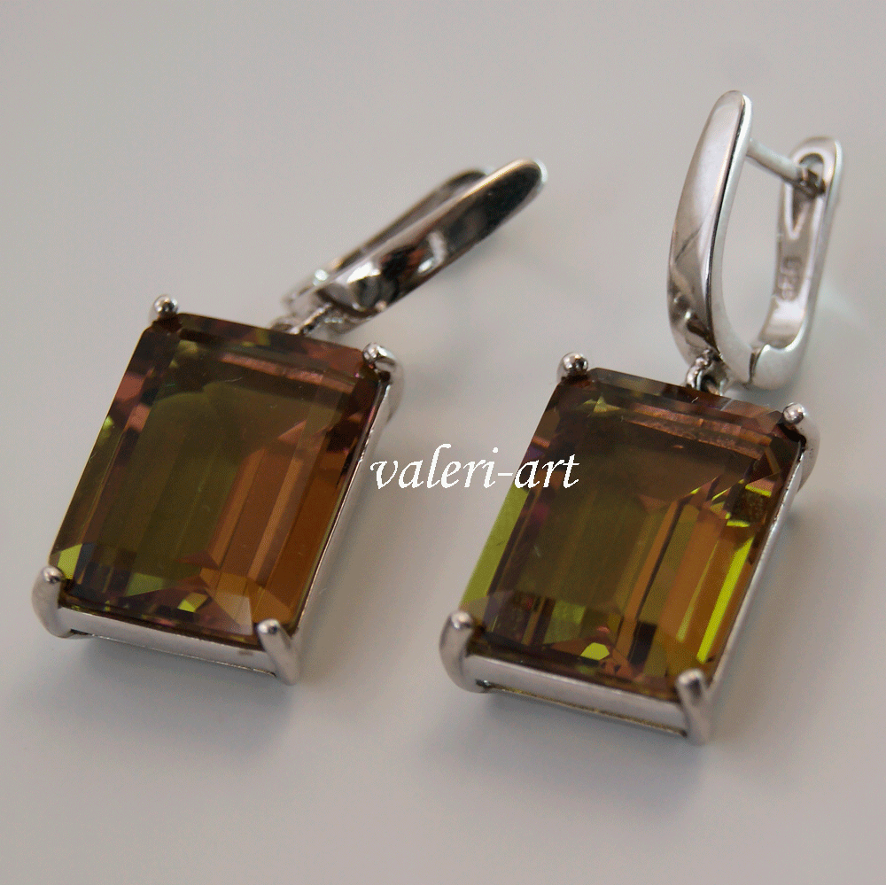 Серебряные серьги с султанитом г/т. Роскошные серьги. Очень эффектное, очень яркое украшение из родированного серебра и султанита г/т. Камень меняет свой цвет в зависимости от освещения. Камень то зеленый, то медово-горчичный, то фиолетовый. Идеальный подарок! Способность султанита менять цвет – его главная прелесть и загадка. Известно о таких же свойствах аметиста и александрита, но у нашего камня более разнообразная гамма оттенков. При тусклом освещении или в пасмурный день он зеленый, словно молодая трава. При свете поярче он приобретает коричневые, янтарные, желтые оттенки.